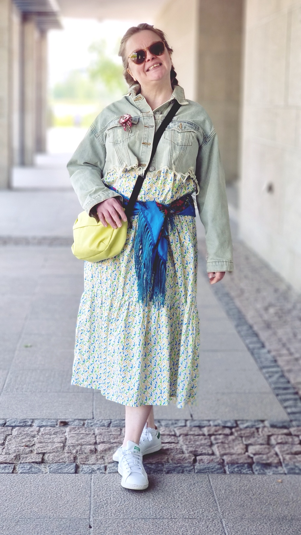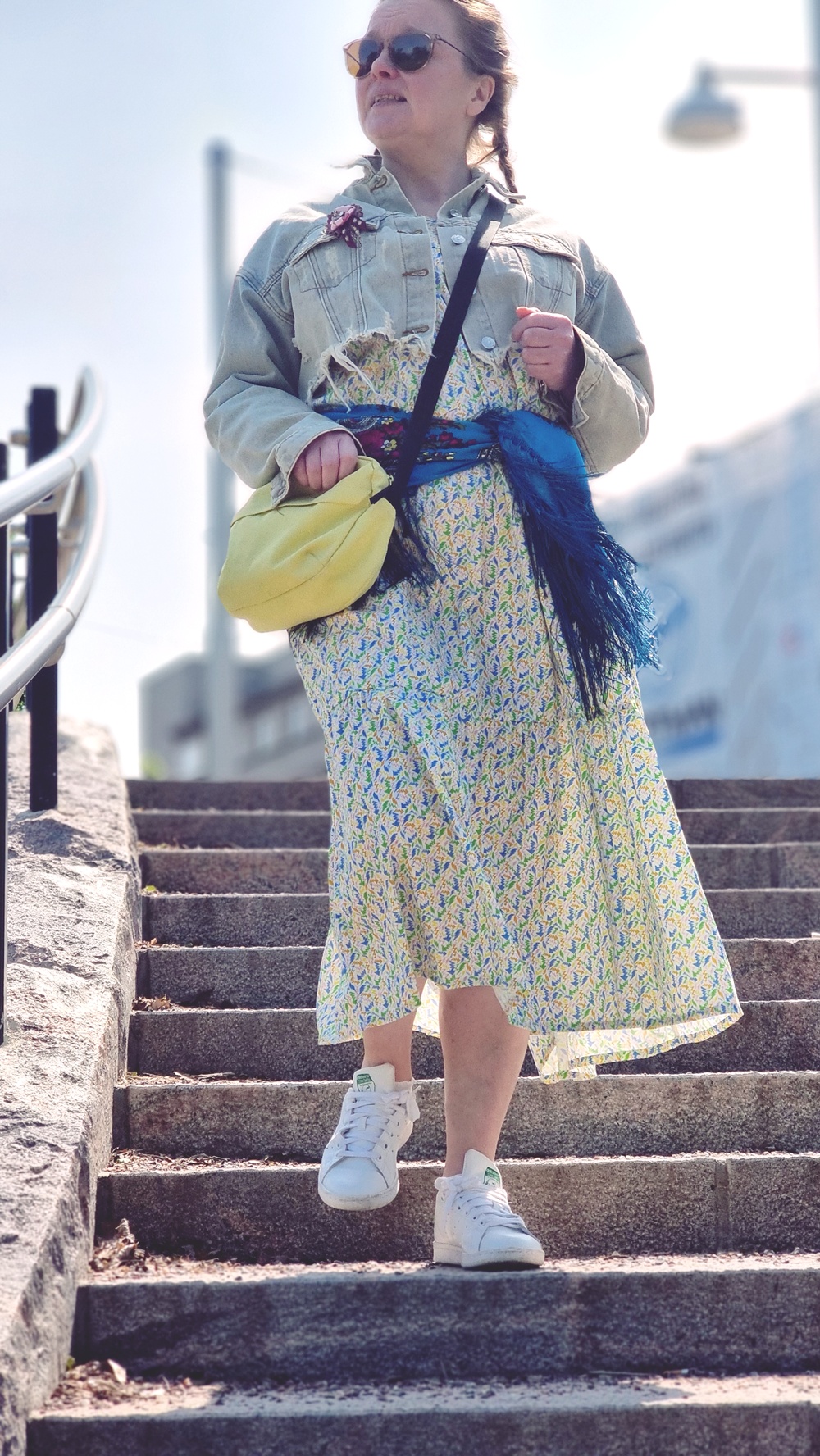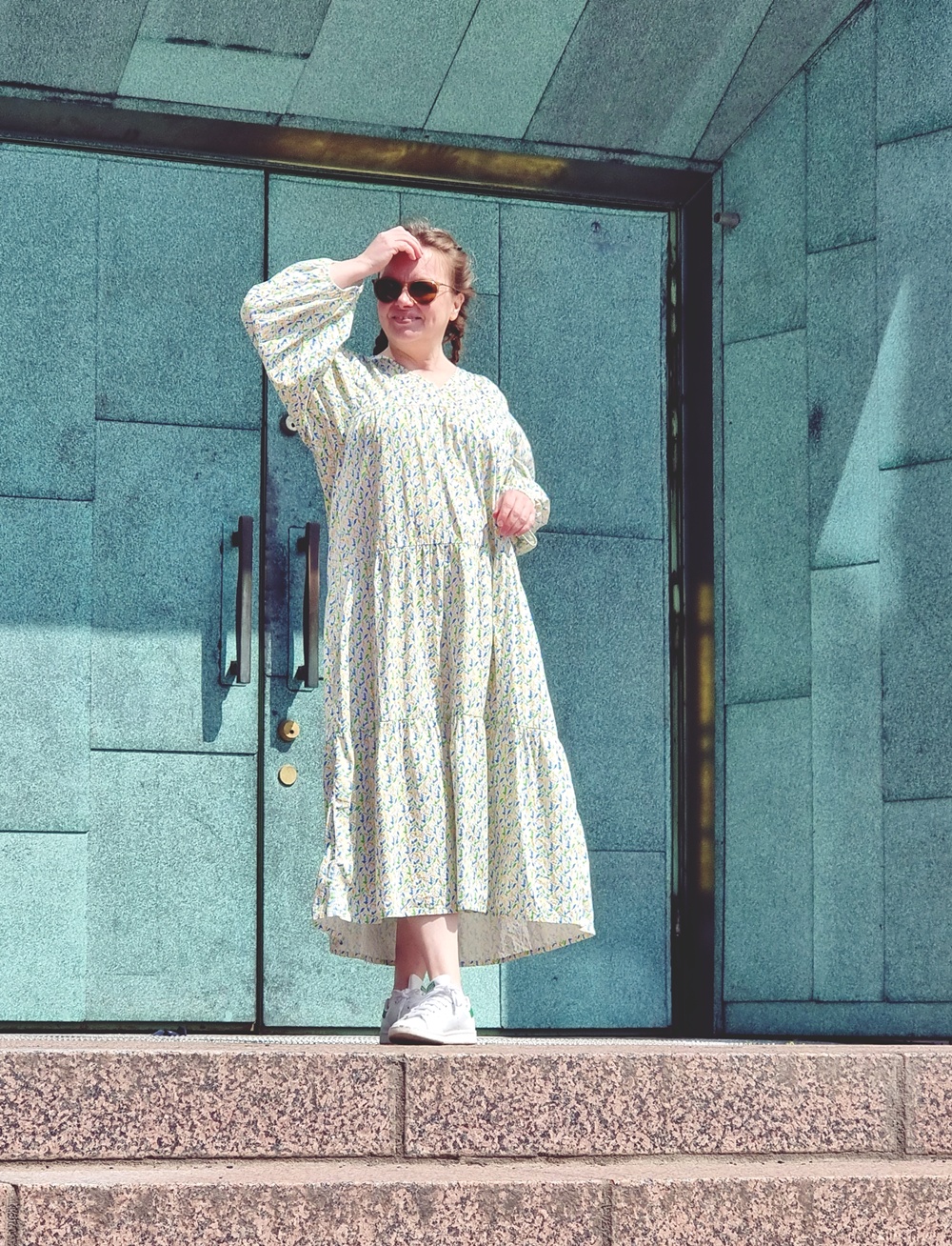 • Päälläni oli IvanaHelsingin mekko, jonka ostin loppukeväästä Relovesta. Se oli heräteostos, sellainen, jonka nappasin mukaan kuin vanhan ystävän, vaikka emme olleet koskaan ennen tavanneet. Mekossa oli jotakin tuttua. Kuosi oli kuin keinuva lapsuuden kesä, ja leikkaus vei ajatukset menneisiin vuosikymmeniin.