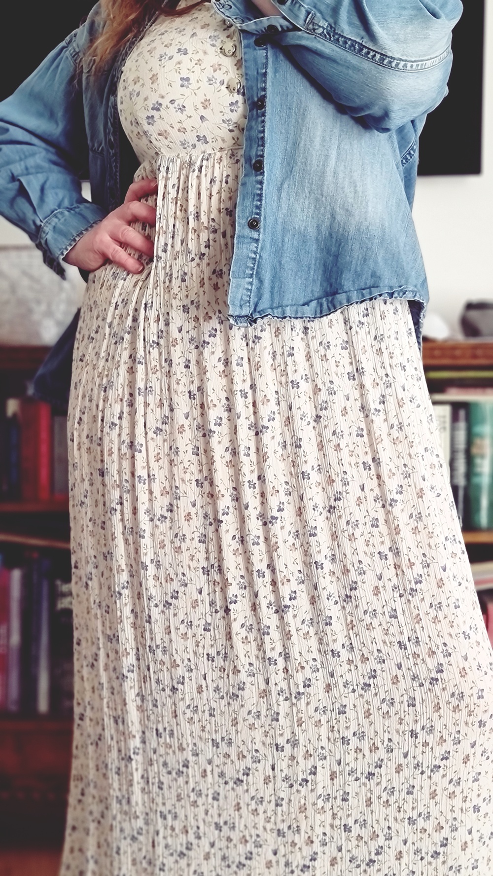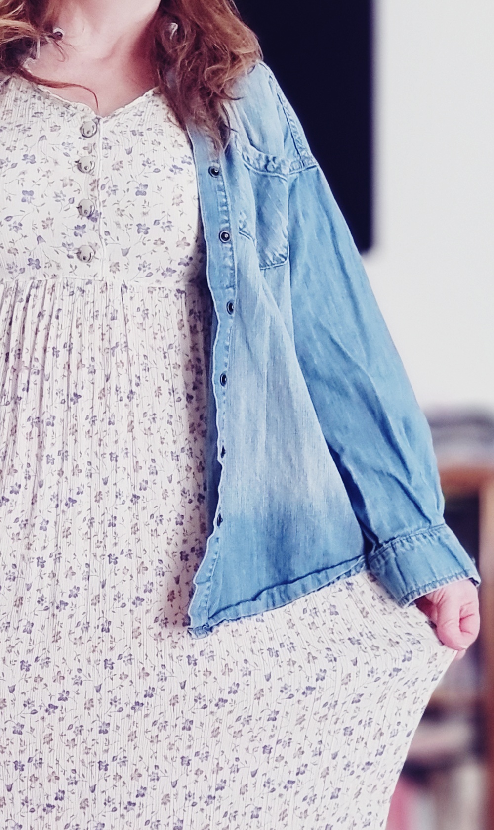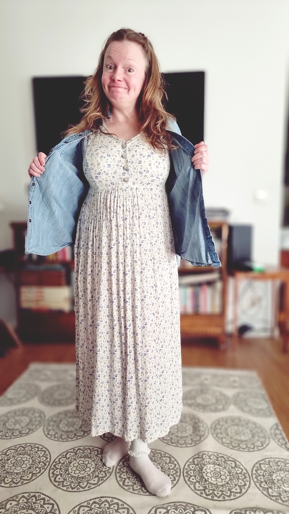 Farkkupaitani puolestaan on kulkenut kanssani jo vuosikymmeniä. Ostin sen joskus 90-luvun alussa ja siitä asti se on nähnyt niin arkea kuin juhlaa. Se on ollut päälläni festareilla, muutoissa, huonoina päivinä lohtuvaatteena, kun odotin esikoistani ja nyt se sai uuden elämän tämän mekon rinnalla. Farkkupaita on muutenkin vaate, joka ei koskaan mene pois muodista, se vain löytää aina uuden tavan olla ajankohtainen. Ja mikä parasta: se pehmentyy käytössä, mukautuu käyttäjäänsä ja kulkee mukana kuin hyvä ystävä.