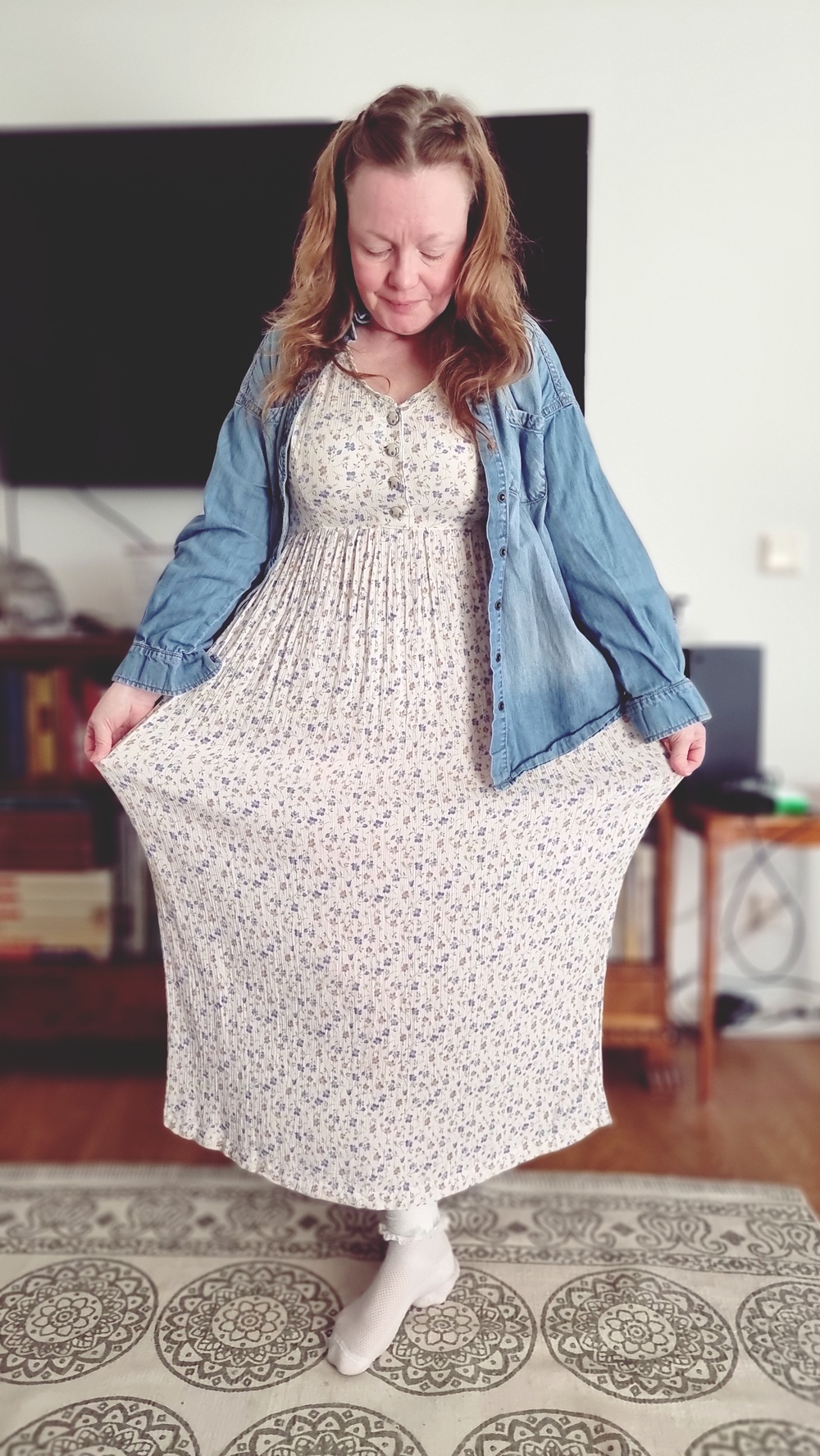 Uuden ja vanhan yhdistäminen ei ole vain esteettinen valinta, vaan myös vastuullinen teko. Jokainen kierrätetty vaate on askel kohti kestävämpää maailmaa. Kun käytämme, huollamme ja yhdistämme vanhoja vaatteita uudella tavalla, vähennämme tekstiilijätettä ja osoitamme, että muoti voi olla sekä kaunista että kestävää. Ja kun vaate tuntuu hyvältä päällä, kuten tämä kukkamekko ja farkkupaita tekevät, silloin tiedän olevani oikeilla jäljillä.