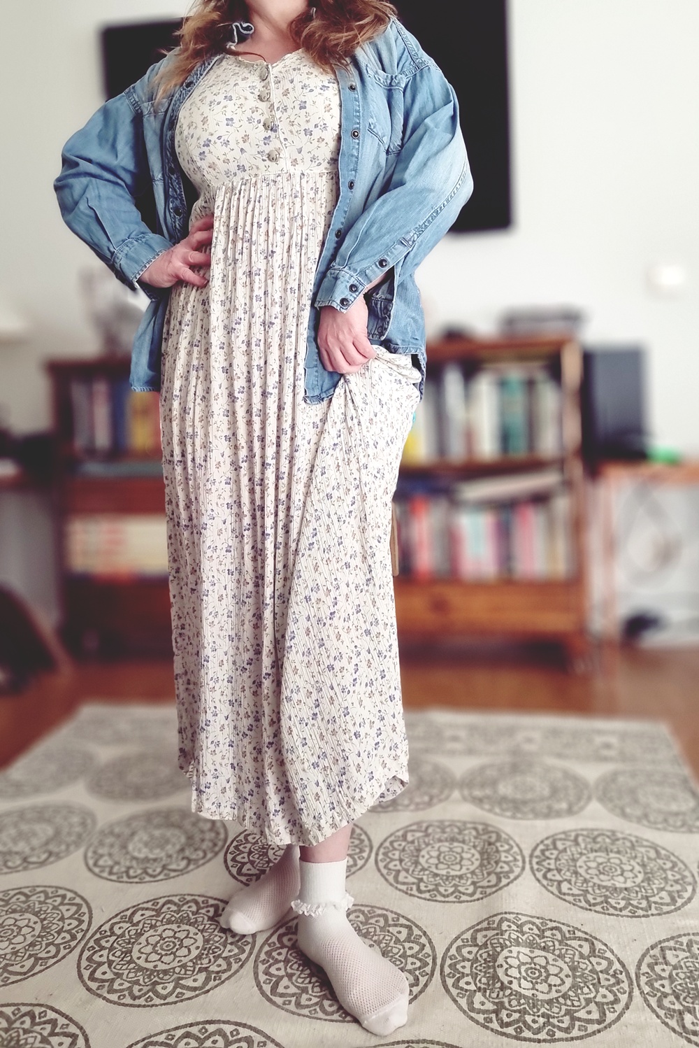 Moni sanoo, että tyyli, jota käytti nuorena, ei sovi enää keski-ikäiselle. Olen aivan toista mieltä. Tyyli ei ole ikäkysymys, se on identiteetin ilmaisua, iloa, leikkiä ja itsensä hyväksymistä. Jos jokin vaate saa sinut tuntemaan olosi hyväksi, se toimii, oli ikä mikä tahansa. Tämä asu on minulle muistutus siitä, että voin yhä käyttää niitä elementtejä, jotka joskus määrittelivät minua, mutta nyt uudella tavalla. Farkkupaita ei enää yhdisty minihameeseen ja platformeihin, vaan herkkään kukkamekkoon, pehmeisiin pastelleihin ja elämänkokemukseen.
