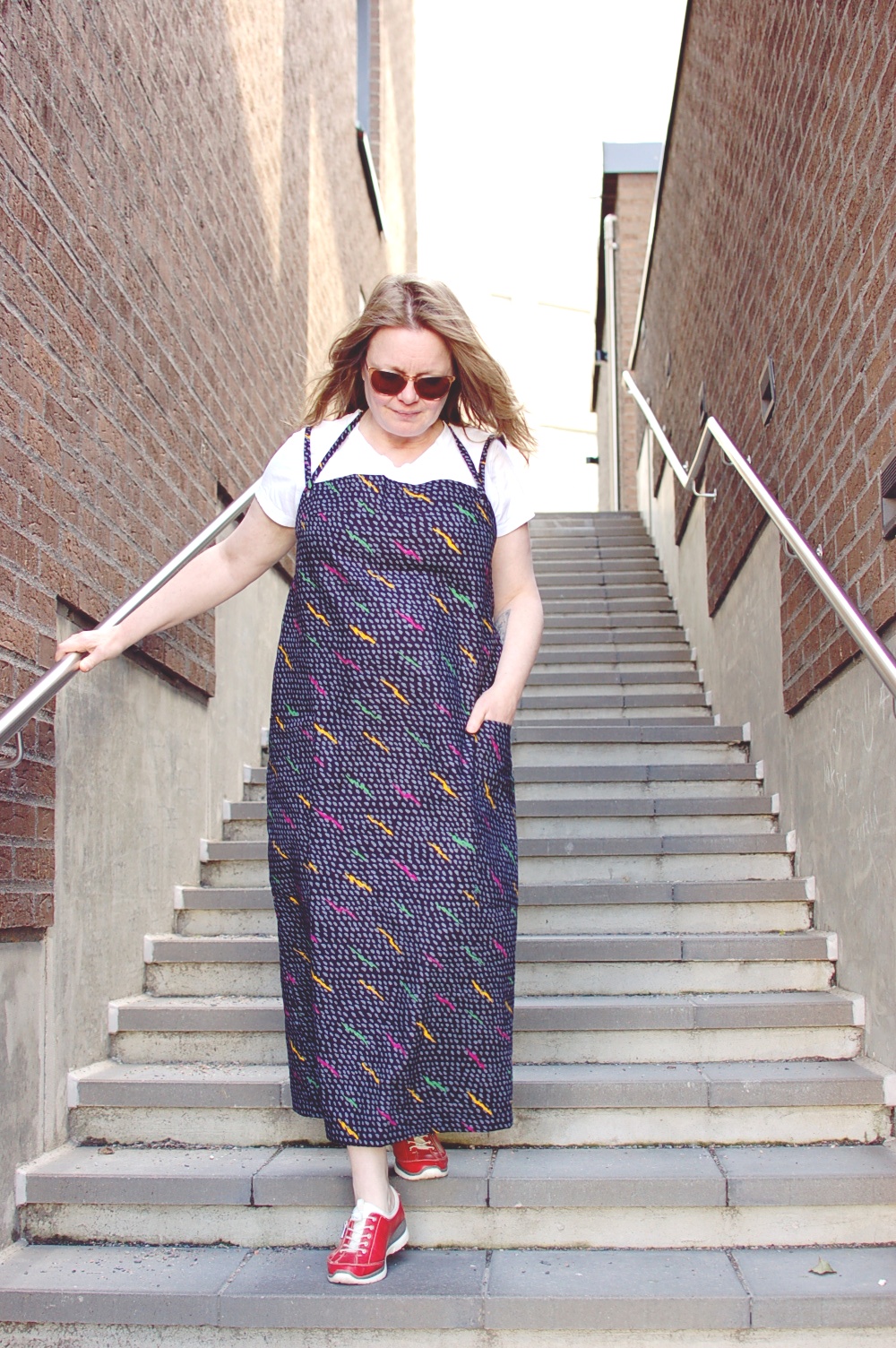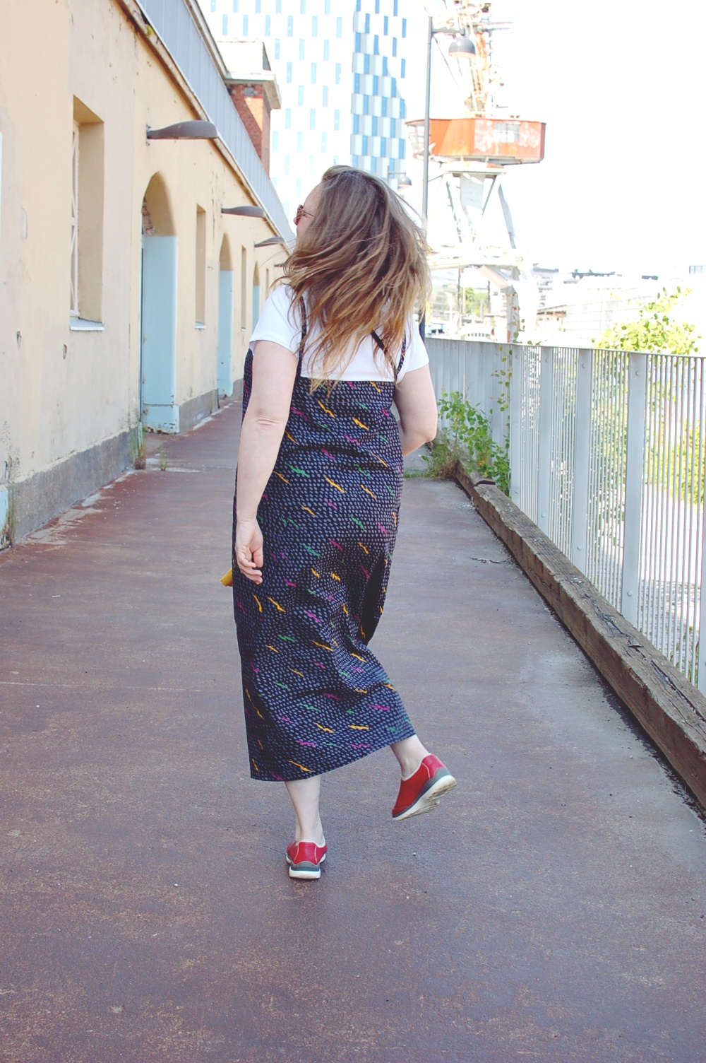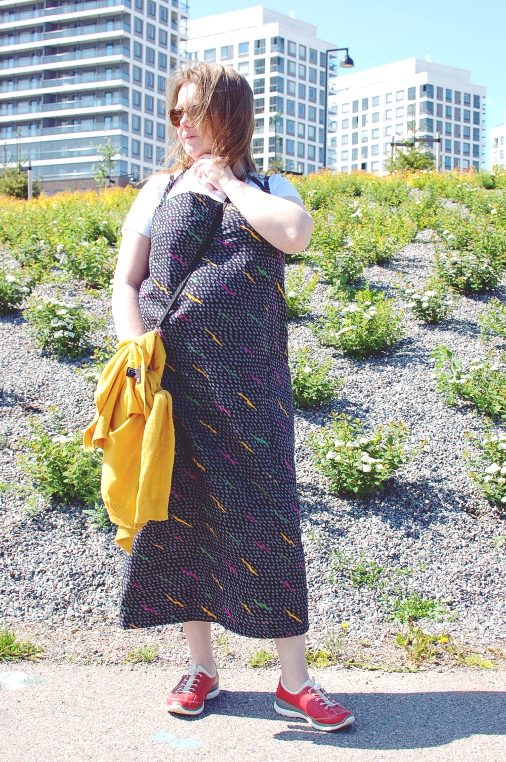 Halusin pitää mekon mahdollisimman helppona ja mukavana, mutta silti kiinnostavana. Neonväriset salamat tekevät yksinkertaisesta siluetista hauskan ja katseenvangitsevan. Tämä mekko ei ota itseään liian vakavasti, se sopii juuri täydellisesti juhannuksen leppoisaan ja iloiseen tunnelmaan.