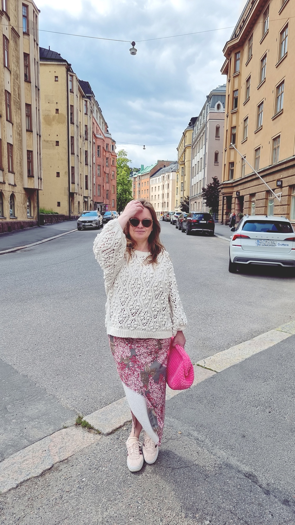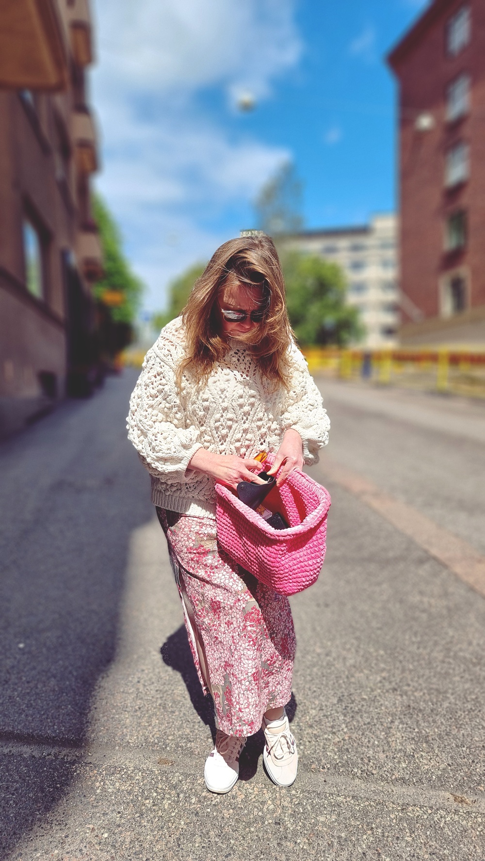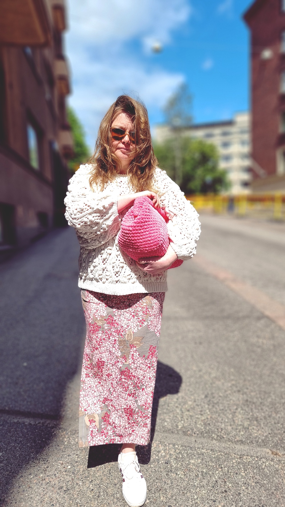 Päälläni oli Lindexin neulottu, luonnonvalkoinen puuvillaneule, täydellinen sekoitus boheemia ja käytännöllistä. Hame on itse tehty, ilman kaavaa, suoraan inspiraatiosta ja ompelukoneesta syntynyt, vähän kuin koko elämä. Kädessäni kannoin itse virkkaamaani pinkkiä laukkua, koska kuka sanoo, ettei juhannuksena voi olla näyttävä? Ja jalassa Adidaksen tennarit, koska askel kantaa paremmin, kun se on mukava.