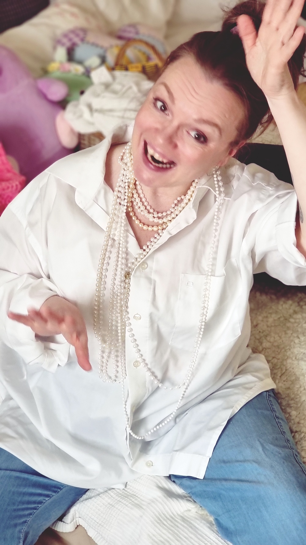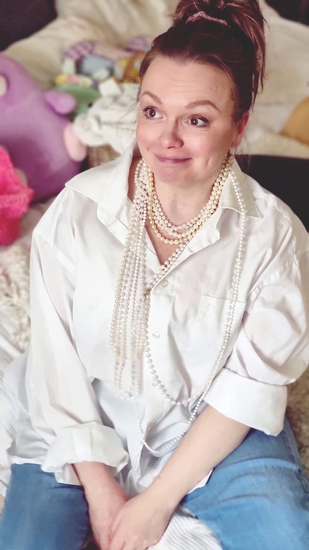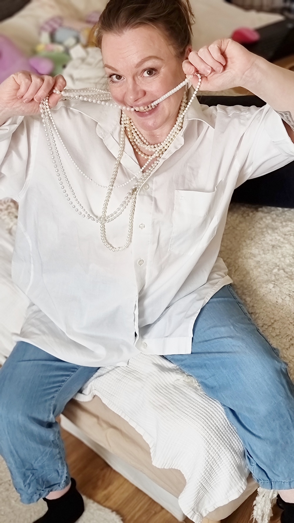 Kun mies katoaa ja kauluspaita jää roikkumaan kaappiin. Asu sai alkunsa aivan sattumalta: tartuin valkoiseen, ylisuureen kauluspaitaan, jonka alkuperä on hämärän peitossa. Se saattoi olla puolisolta napattu tai kirpputorilta pelastettu, kuka tietää. Mutta kun sen yhdisti rentoihin kuminauhavyötäröisiin kesähousuihin, tilanne karkasi käsistä. Peilistä katsoi joku, joka ei ollut enää minä, vaan joku, joka oli juuri astunut ulos 60-luvun ranskalaisesta elokuvasta. Tai vähintäänkin pyörinyt liian pitkään Pinterestissä hakusanalla “chic but chaotic”.