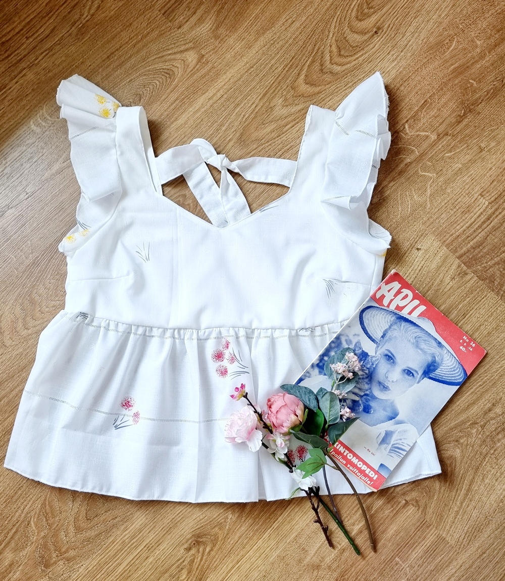 Sain synnytettyä myös kaksi toppia. Mutta ei mitä tahansa toppia! Nämä ovat hörhelöisiä, romanttisia ja juuri sellaisia, joita voi käyttää sekä piknikillä että parvekkeella, riippuen siitä, kumpi on lähempänä. Pehmeät sävyt, hulmuavat reunat ja se ihana tunne, kun tietää ettei tämä vaate ole maksanut luontoäidille mitään ylimääräistä, sehän on jo melkein muotimanifesti! Kaavat löytyivät Mekkotehdas 2 -kirjasta.