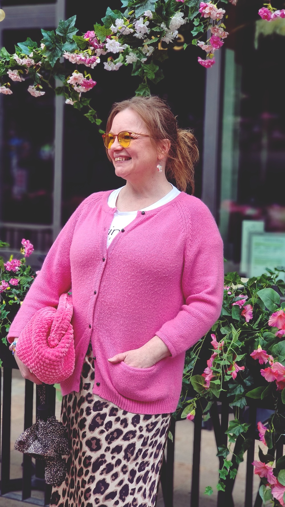 Eläinkuosinen hame ja pinkki neule, asu, joka ei yritä liikaa mutta toimii silti täydellisesti