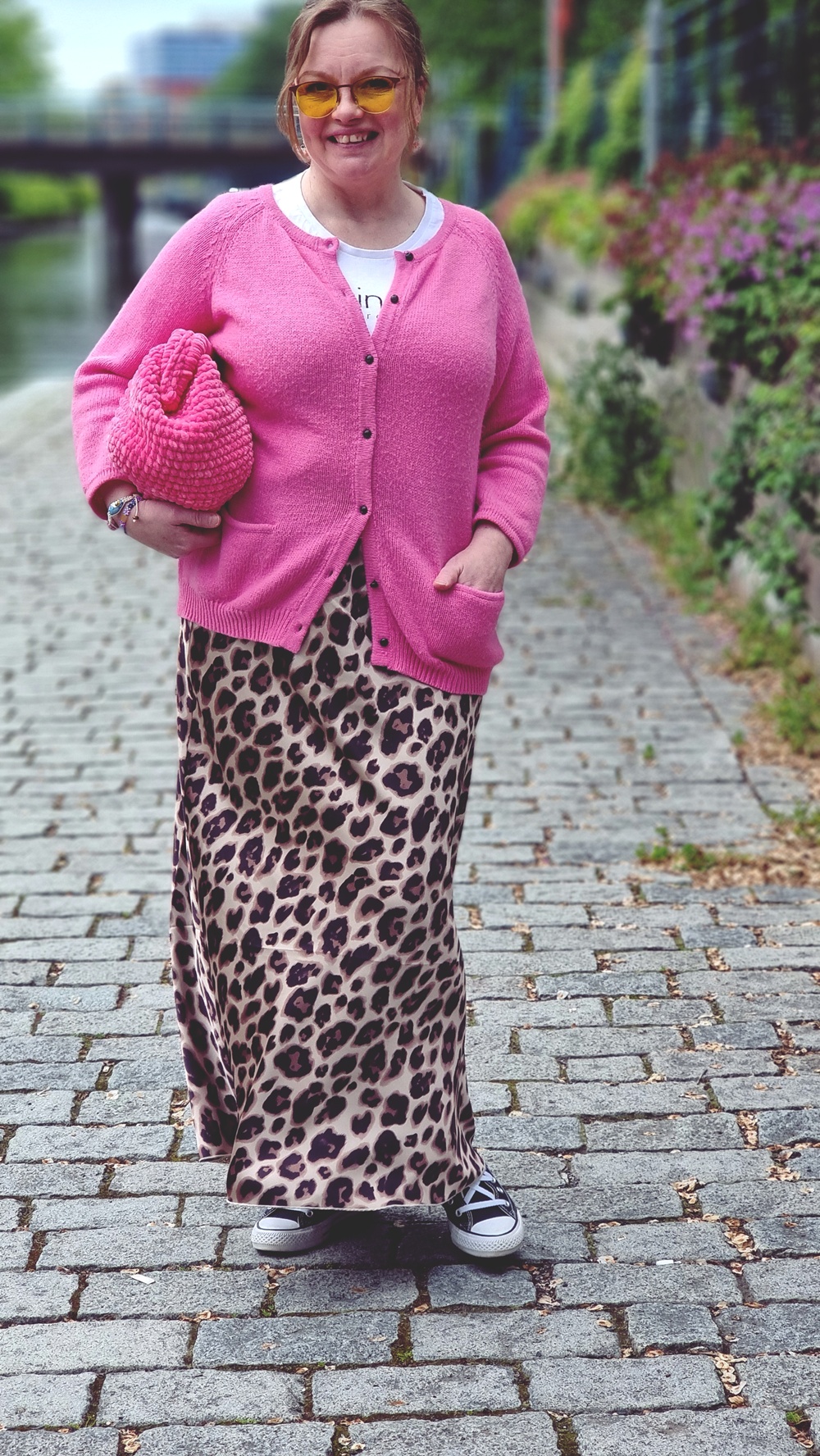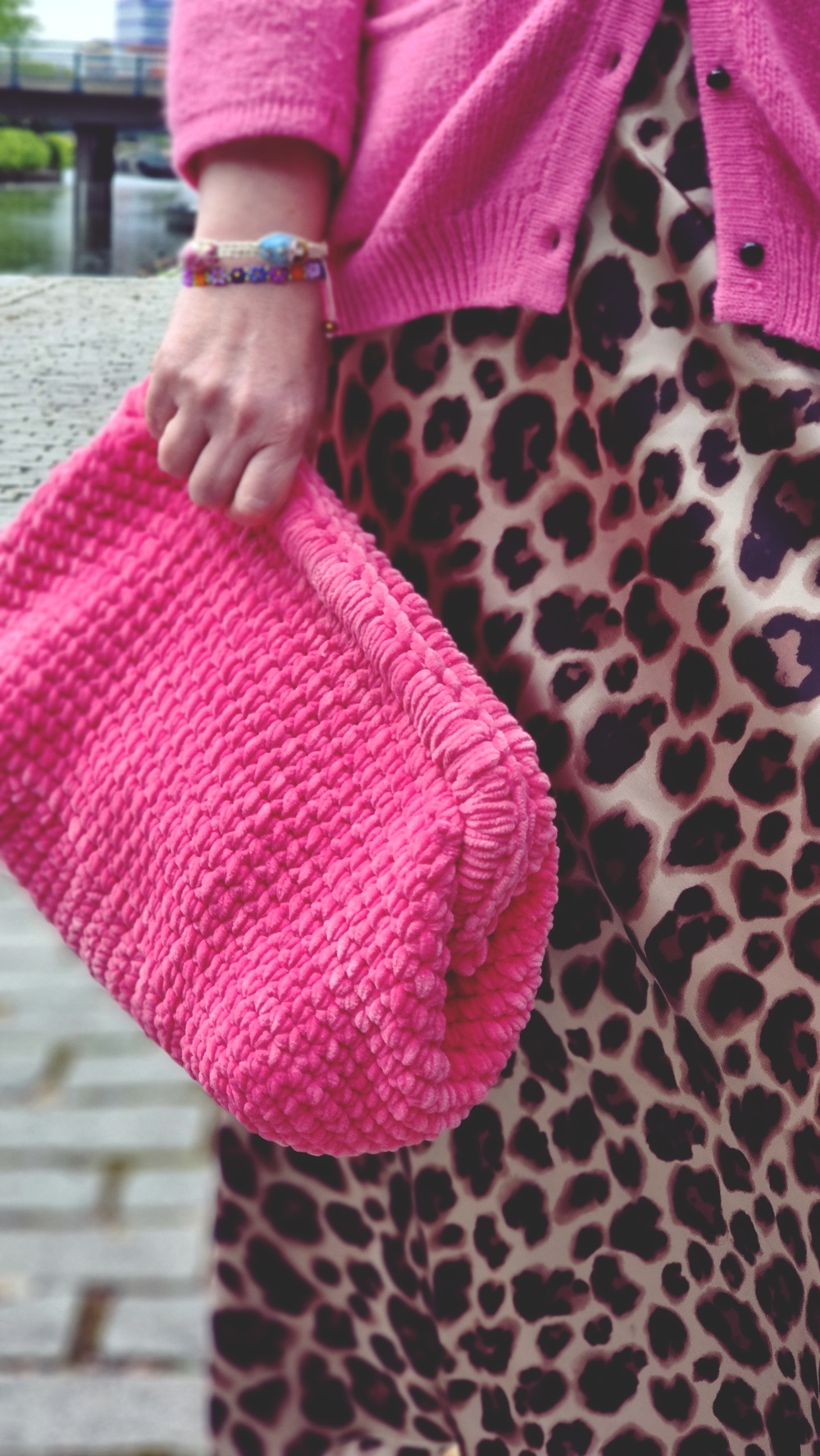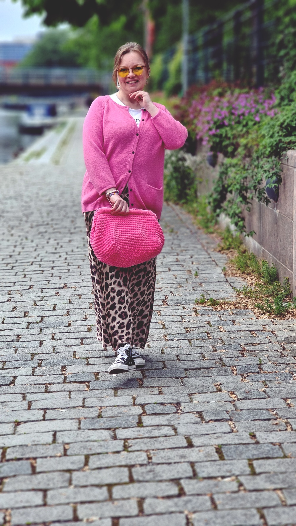 Tämä kombo, eläinkuosi, pinkki neule, virkattu laukku ja Converset, voisi ehkä olla jonkun mukaan tyylirikko, mutta minulle se on persoonallinen harmonia. Vähän kuin laittaisi kahvimaitoon kauramaitoa ja se olisi juuri oikein.