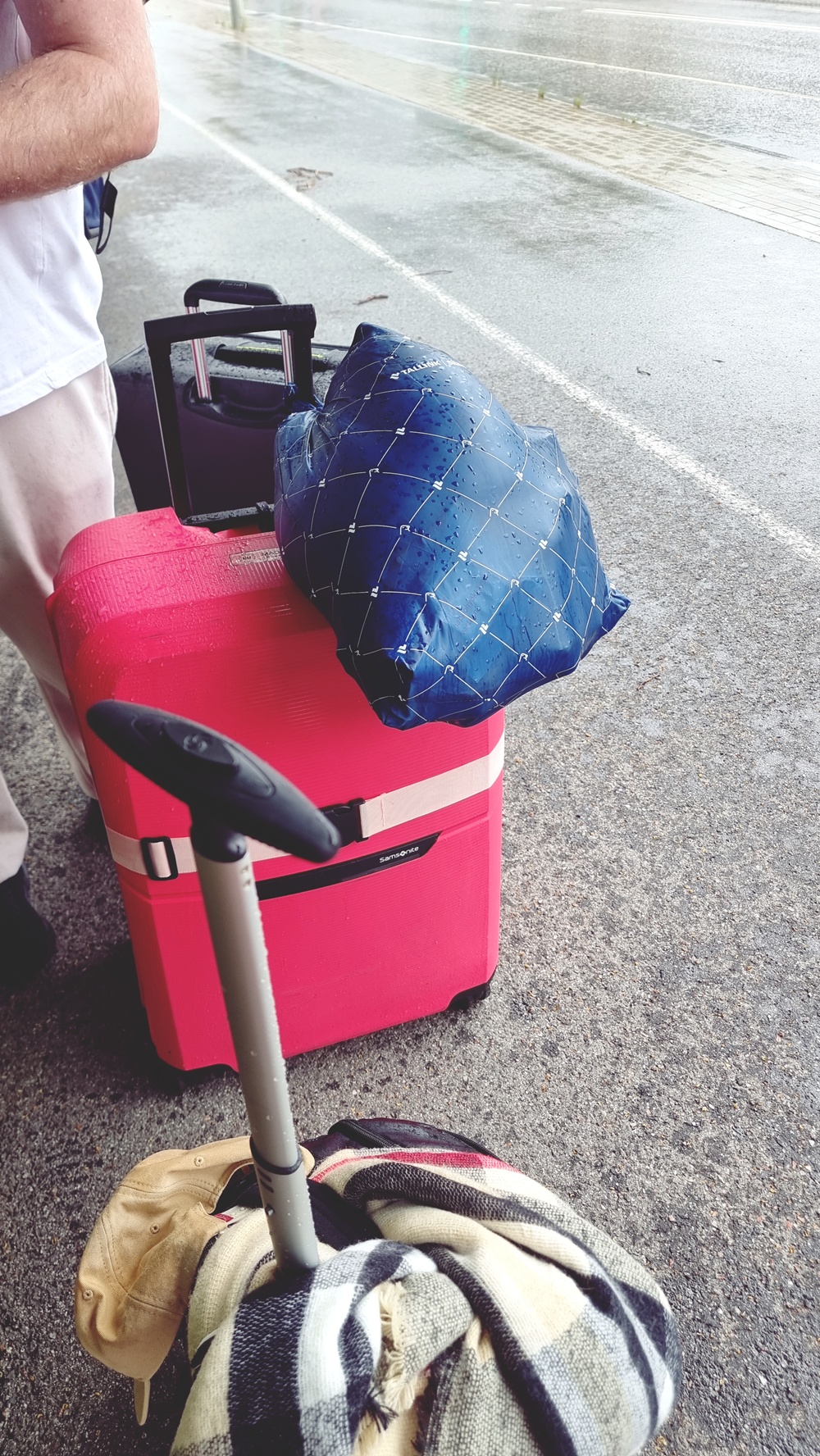 Näytös 0,5 : Märkiä matkalaukkuja ja valuvia sukkia (Tallinnan satama, tihkusade muuttuu hiljalleen vaakasuoraksi kaatosateeksi)