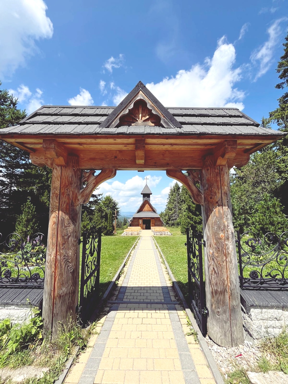 Avaan ikkunan, ja ensimmäinen asia jonka näen, on vuori, jonka huipulla seisoo 15 metriä korkea rautaristi. Se näyttää siltä kuin katsoisi kylää ja meitä kaikkia vähän lempeän tuomitsevasti. Ja samalla jostain alempaa, aivan Willa Lelujan takapihalta, kuuluu ääniä, joita ei ihan heti osaisi yhdistää vuoristokaupunkiin: lampaita ja lehmiä. Siinä ne seisovat kuin mitään erikoista ei olisi. Määkiminen ja ammunta sekoittuvat varisten keskusteluun. Heräämme hymyssä suin. Ja samalla, huomaamattamme, syntyy tämän päivän otsikko: pörröinen aamu, puinen parveke, pilvinen risti.