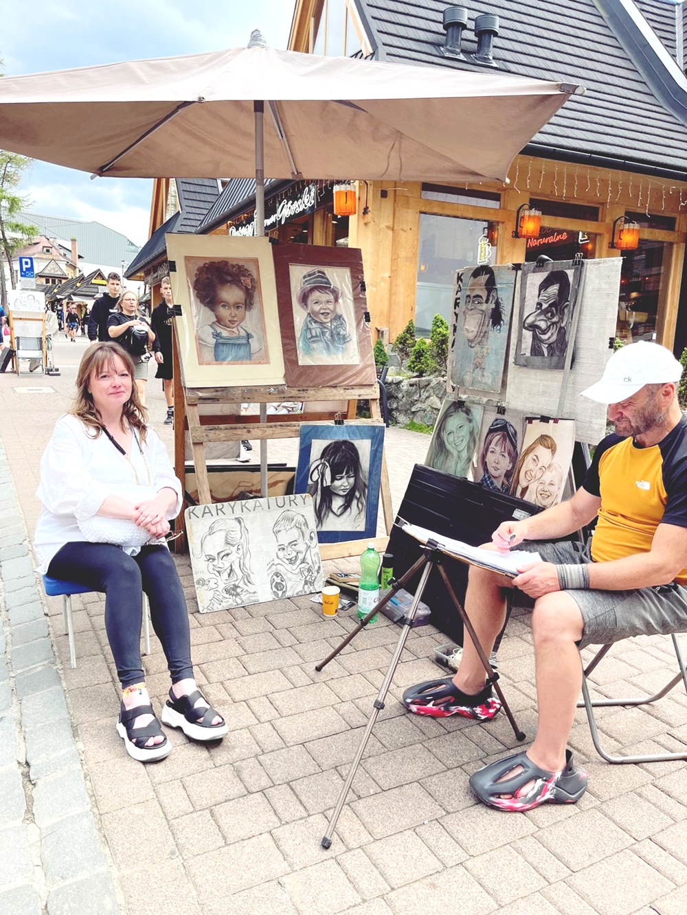 Kävelemme vielä Krupówki-kadulla, Zakopanen vilkkaimmalla reitillä. Joka kulmassa joku laulaa, joku tanssii, joku myy jotain. Yhtäkkiä huomaan vanhemman miehen, joka piirtää hiilellä nopeita muotokuvia. Hänen töissään on jotain jotain pysähtynyttä ja vilpitöntä. Ilmeitä, jotka eivät ole vain kopioita, vaan tulkintoja.