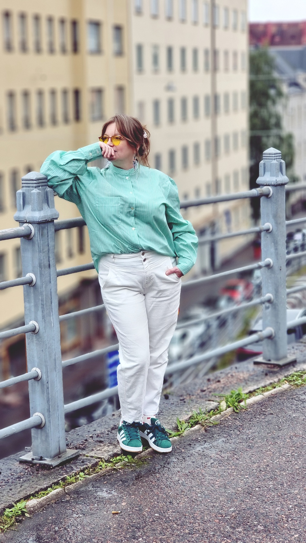 Valitsin ylleni itse tekemäni vihreän raidallisen paidan. Sen kaava löytyy SY – 10 matchande nyckelplagg -ompelukirjasta, josta olen saanut paljon inspiraatiota ompeluun. Kun paita sujahti päälle, muistin taas sen tunteen: käsin tehdyt vaatteet kantavat mukanaan aivan erityistä tarinaa. Ne eivät ole vain kangasta ja lankaa, vaan osa tekijänsä identiteettiä.