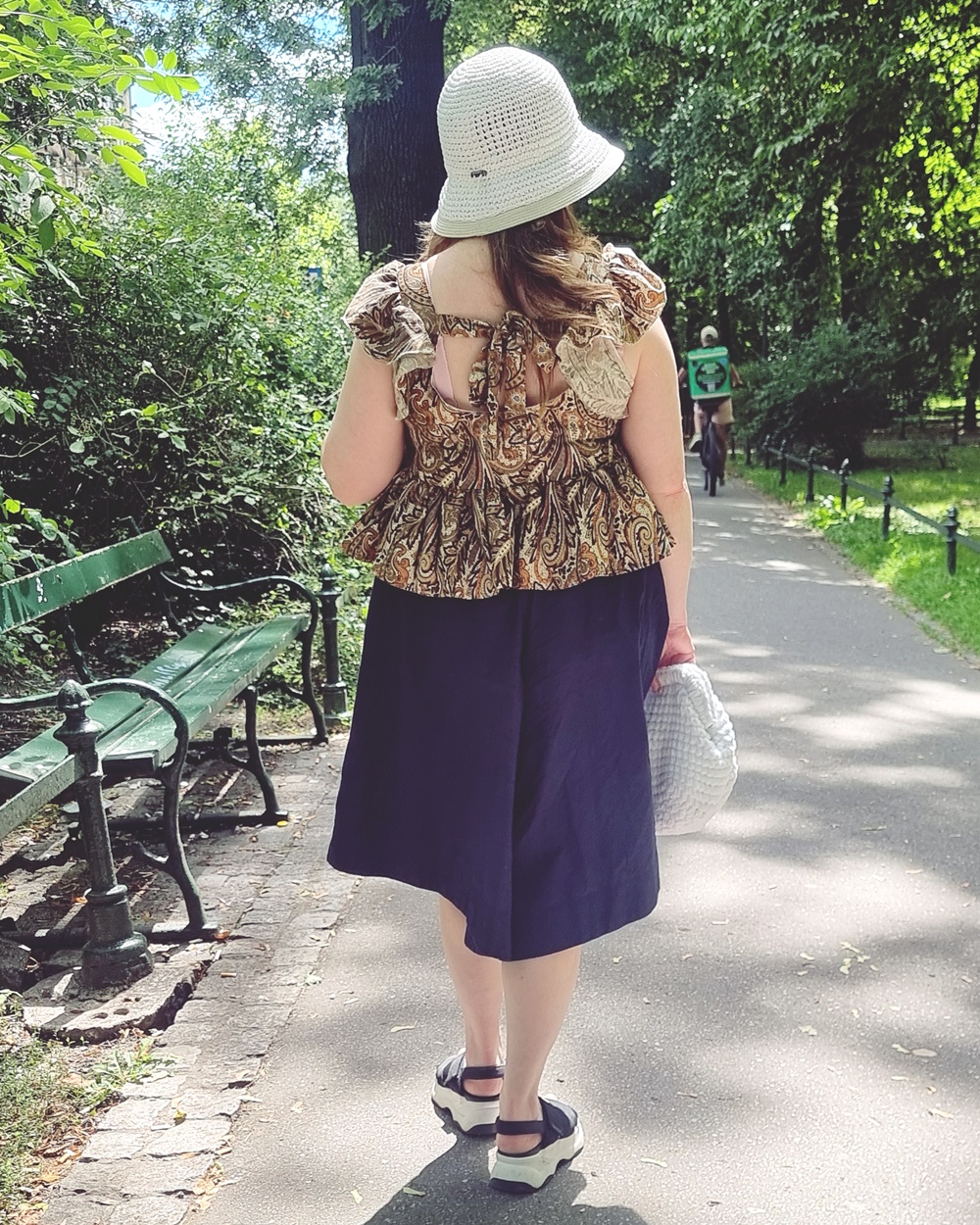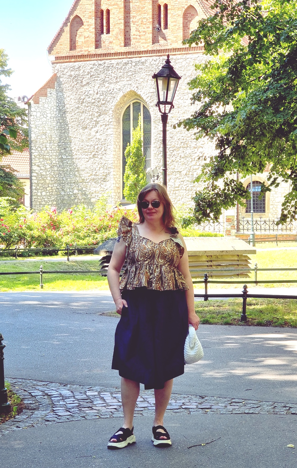 Jalkoihin valitsin laivalta ostetut sandaalit, jotka ovat ennen kaikkea mukavat. Paksu pohja tekee kivetyistä puistopoluista ystävän, ei vihollisen. Yhdistelmä boheemia toppia, rennon tyylikästä housuhametta ja sporttisia sandaaleja tekee tästä puistokävelyasusta käytännöllisen ja hauskan.