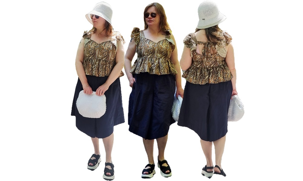Jos pitäisi valita vain yksi kesäasu, joka kuljettaisi läpi helteisen kaupungin, rennon puistokävelyn ja jäätelötauon, se olisi tämä, kesäpäivän täydellinen yhdistelmä. Tämä kokonaisuus on kuin postikortti minusta itsestäni: kierrätettyä materiaalia, käsityötä, matkamuistoja ja ripaus rentoa luksusta, joka ei ota itseään liian vakavasti.