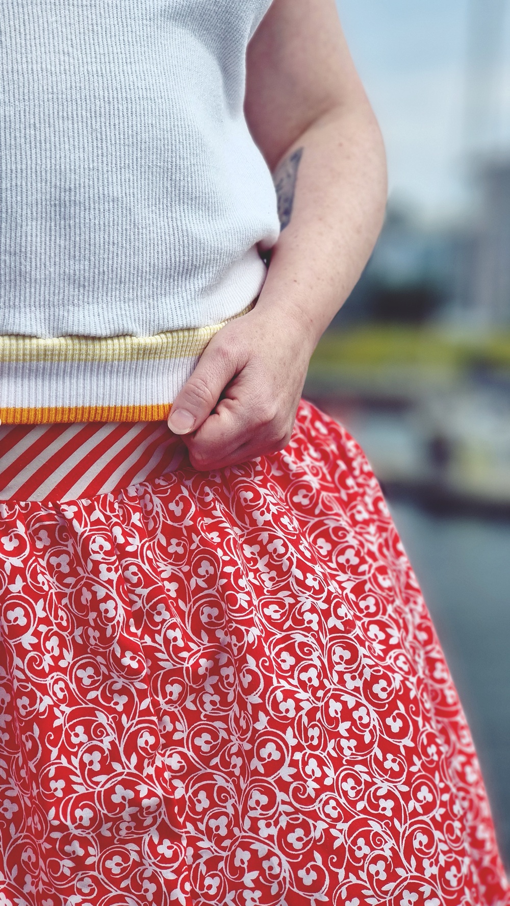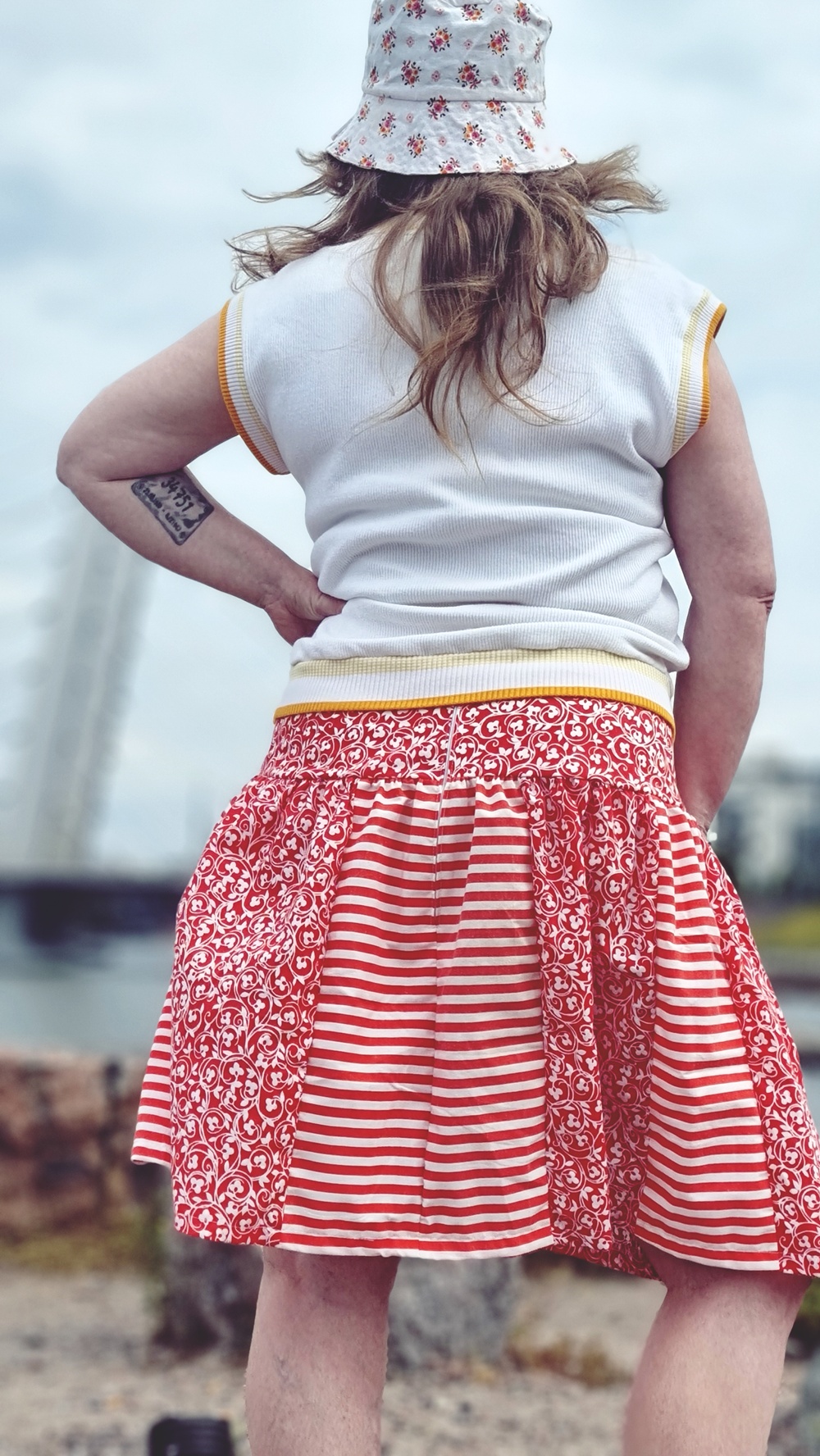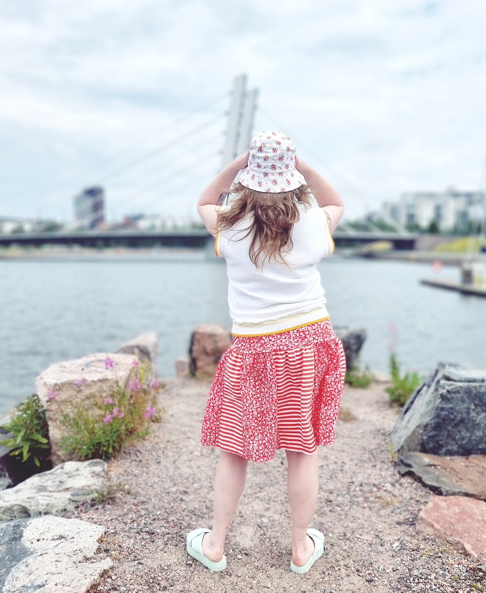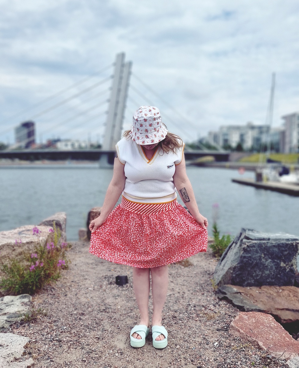 Vyötärö on raidallinen kuin karkkipaperi, helma taas kukallinen ja punainen kuin vanha emalikulho. Yhdessä ne muodostavat niin pirteän liiton, että jopa taustan pilvet yrittävät näyttää aurinkoisilta. Tämä ei ole vain vaate, tämä on tekstiilien comeback, revanssi, uusintaottelu.