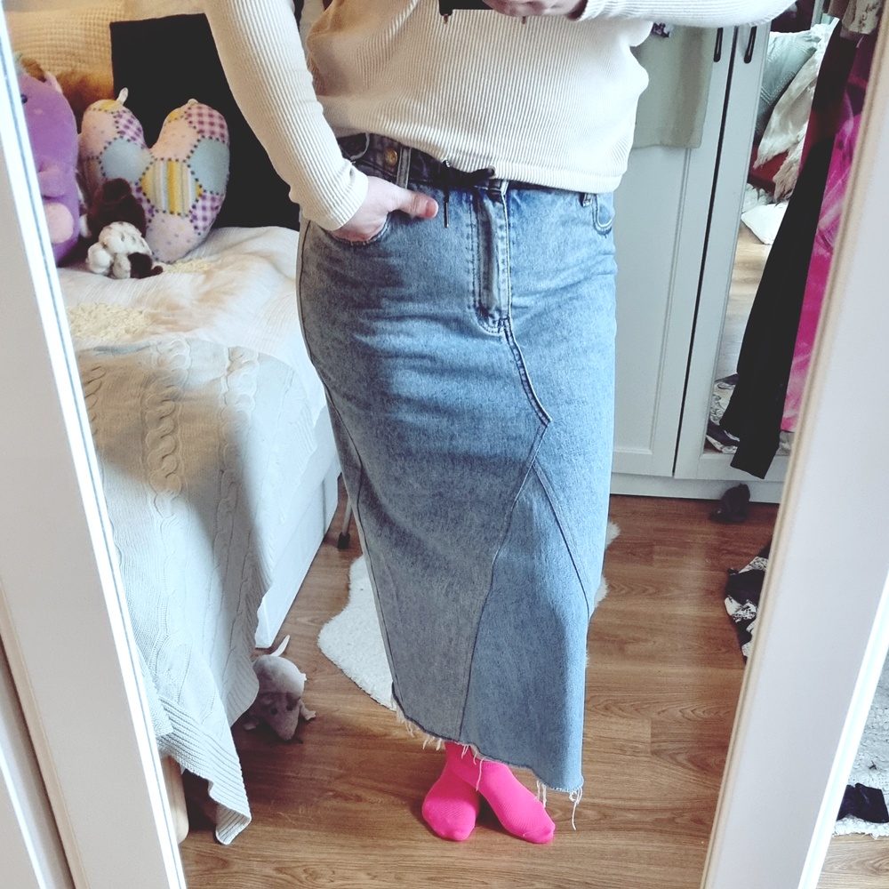 Ja sitten se isoin löytö: vanhoista farkuista tehty farkkuhame. Puhutaan nyt kierrätysdivan unelmasta! Se on juuri sopivan rouhea ja siinä on asennetta. Tämä hame tulee olemaan koko syksyn luottovaate.