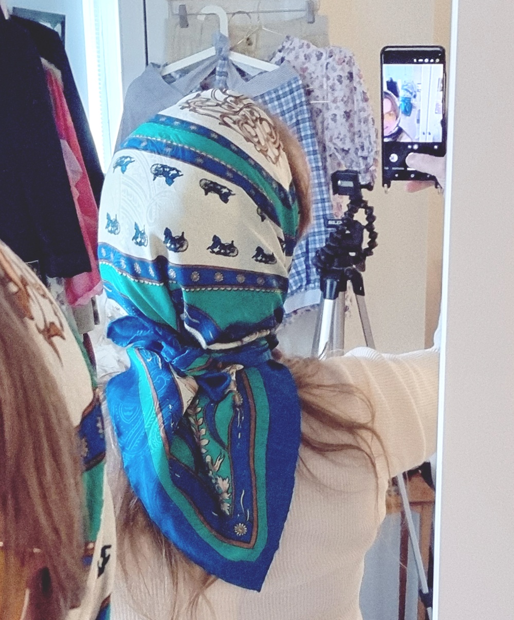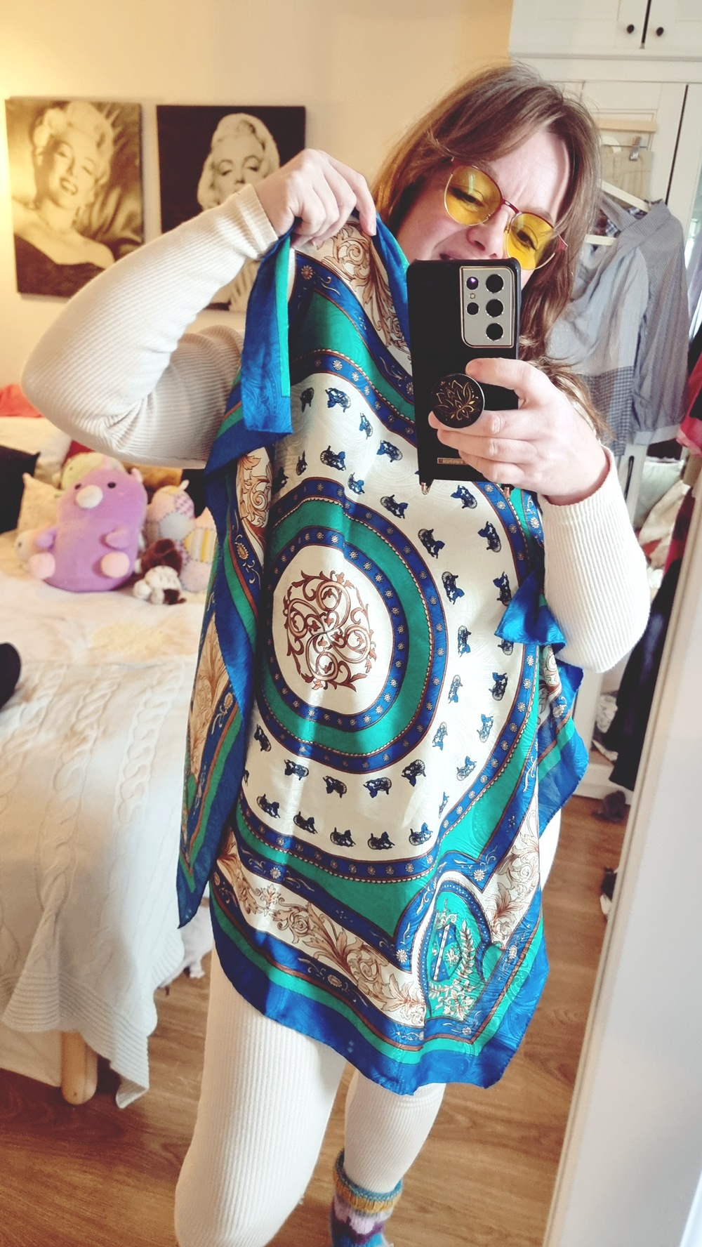 Mukaani tarttui myös huivi, joka tuo juuri sopivasti väriä ja kontrastia. Oikea “statement piece”, kuten muotilehdet sanovat. Tässä kohtaa olin jo varma, että sade oli vain kosminen suunnitelma saada minut tänne tekemään näitä löytöjä.