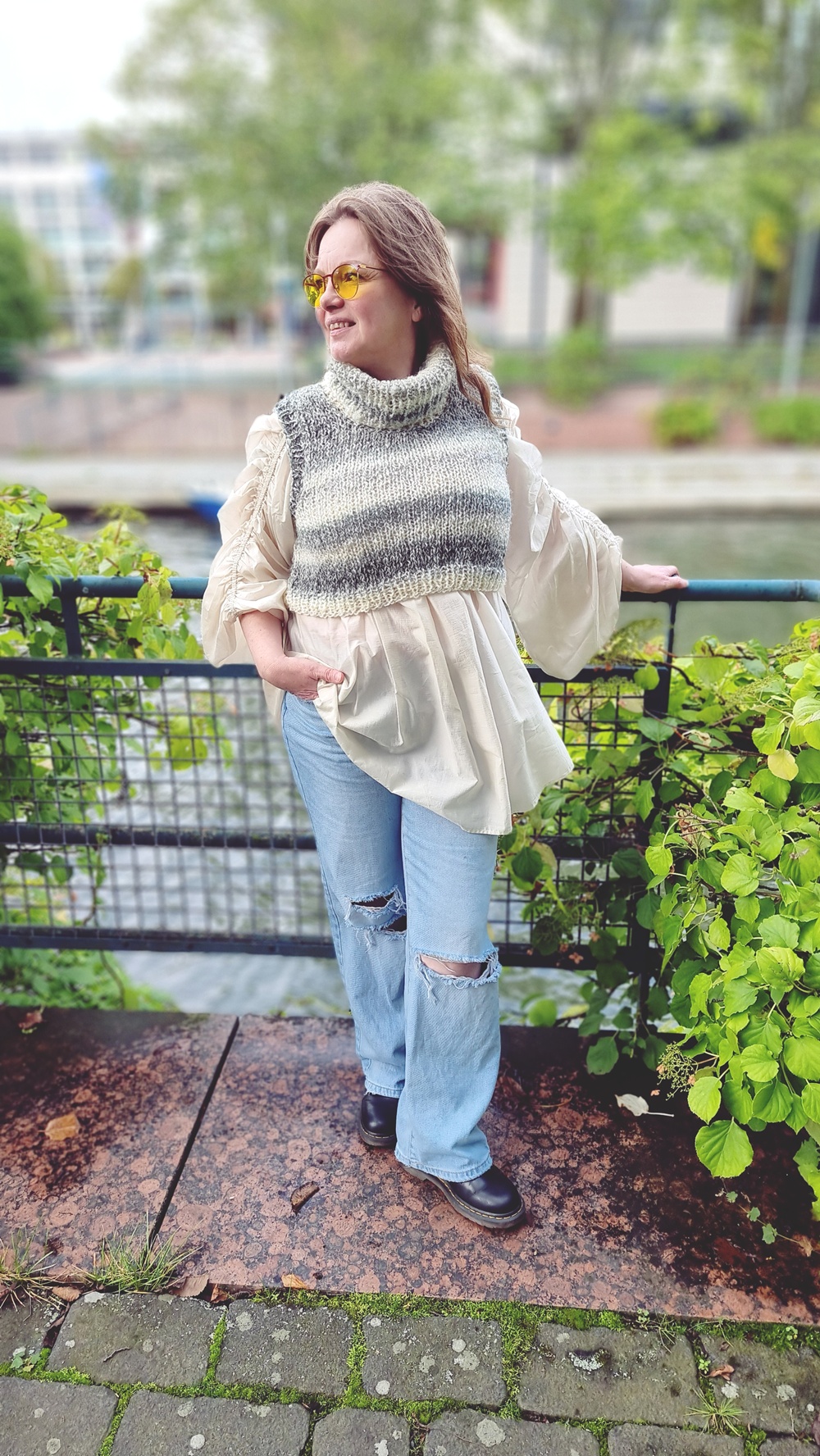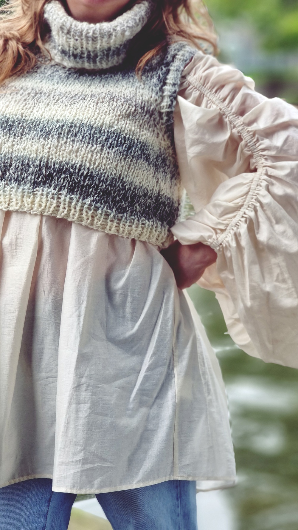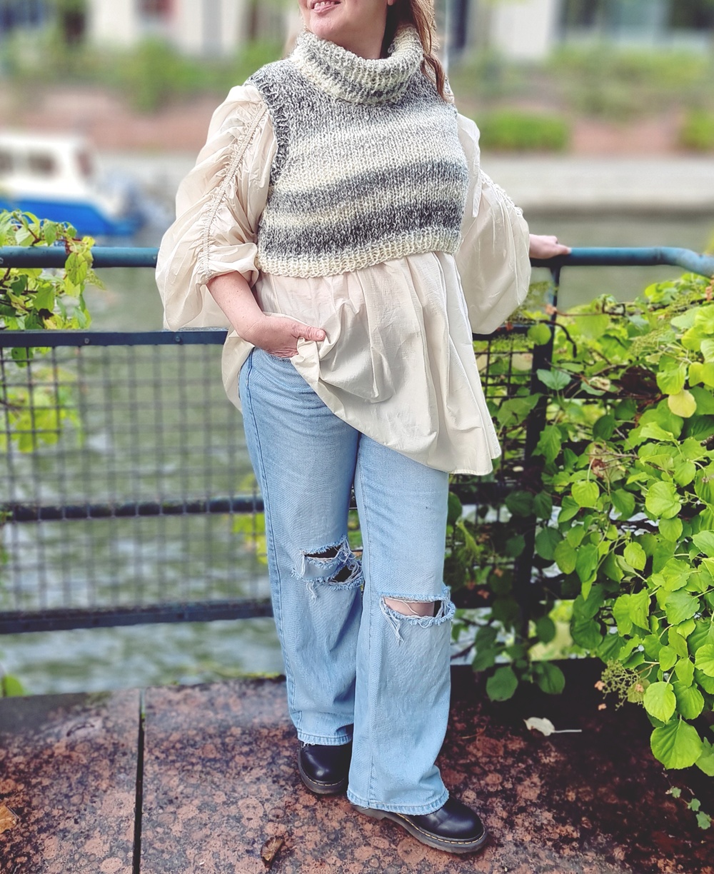 Tämä neuleliivi on vähän kuin elämä itse, ei kaavaa, ei ohjetta, vain lankaa, puikot ja intuitio. Halusin jotain, mikä toisi lämpöä viileään syksyyn, mutta ei tuntuisi liian sidotulta mihinkään tyylilajiin. Liivissä on sopivasti boheemia pehmeyttä, vähän kotikutoista charmia ja juuri sen verran epäsymmetriaa, että se näyttää siltä kuin se olisi ollut olemassa jo vuosia.