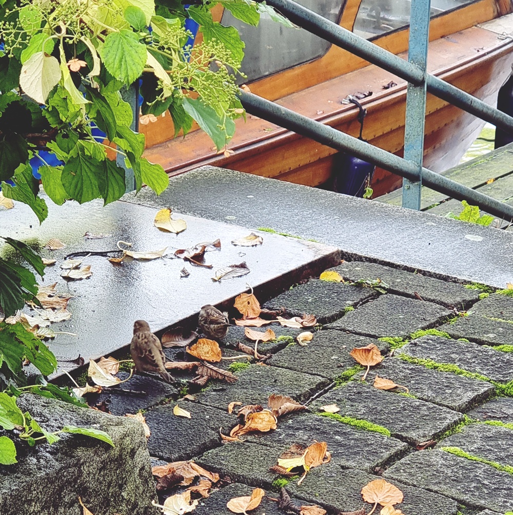 Jätkäsaaressa oli tänään hiljaista, sellaista sunnuntaimaista seesteisyyttä vaikka päivä ei ollut sunnuntai lainkaan. Kanavan varressa näin kaksi pientä varpusta, jotka tutkivat kivetyksen pintaa tarkasti, ehkä ne etsivät pudonneita siemeniä tai vain nauttivat kosteasta aamusta. Hetken aikaa istuin penkillä ja katselin niitä, kuin olisimme kaikki kolme olleet osa samaa maisemaa.