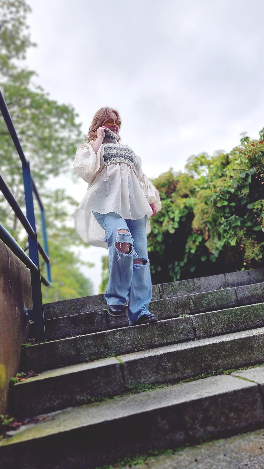 Otin muutaman kuvan itsestäni portailla, farkut ja neuleliivi pääosassa. Oli hauska huomata, että juuri tällaisissa arkisissa, huolettomissa asuissa tunnen oloni kaikkein itsevarmimmaksi. Ei kiristä, ei purista, ei tarvitse miettiä, sopiiko tyyli johonkin dresscodeen.