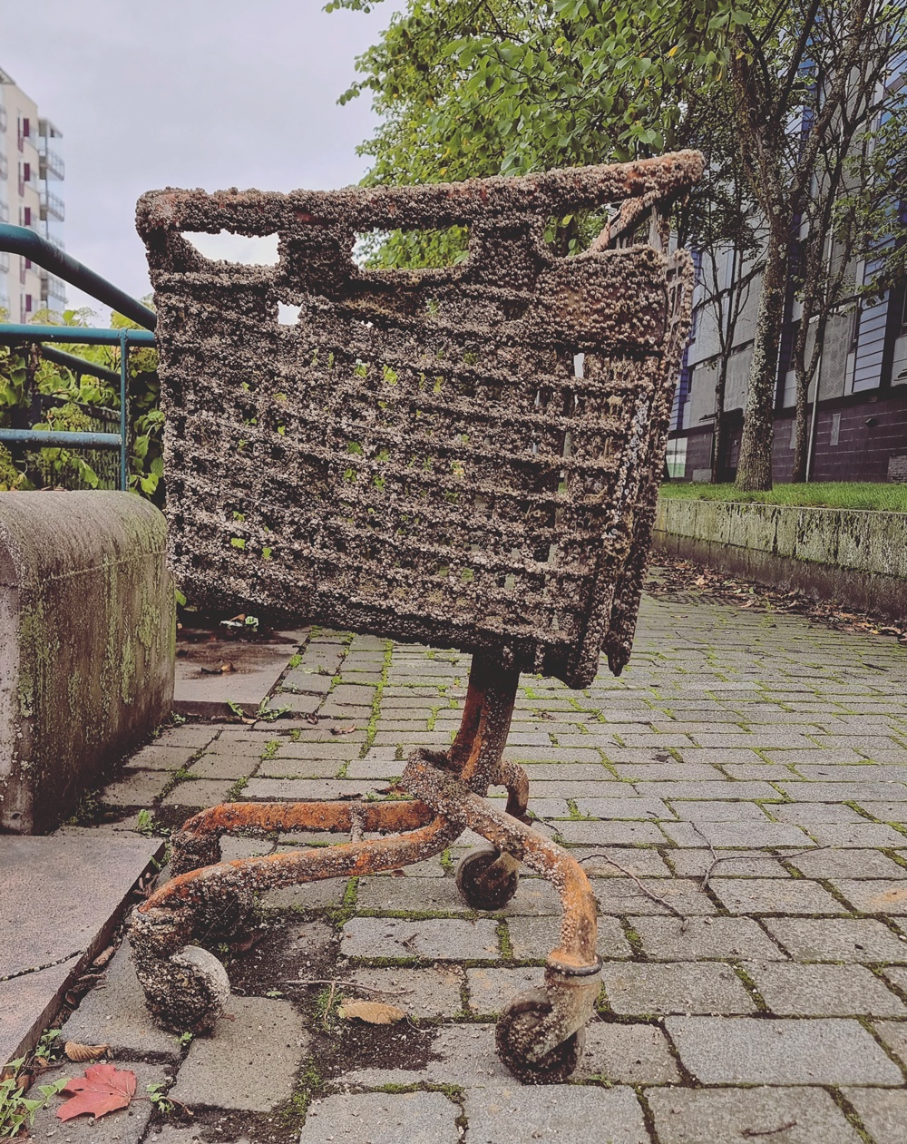 Kävelin sillalle ja pysähdyin katsomaan vettä. Se oli tumma ja tyyni, kuin olisi halunnut kertoa minulle jonkin salaisuuden. Vanha ruostunut ostoskärry makasi kivetyksellä, todennäköisesti joku oli nostanut sen vedestä. Siinä se seisoi, metallinen luuranko, joka oli muuttunut ruskeaksi ruosteesta, tavallinen arjen esine, mutta vedestä pelastettuna se näytti lähes taideteokselta.