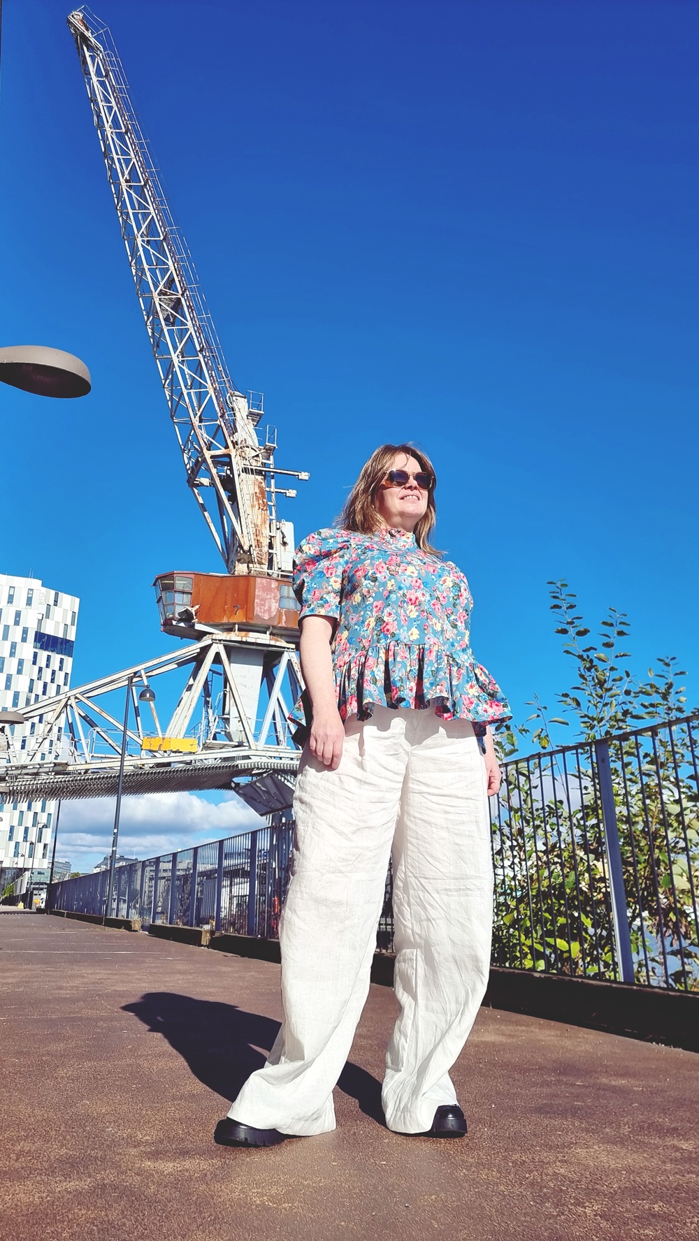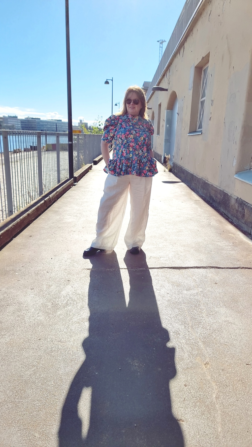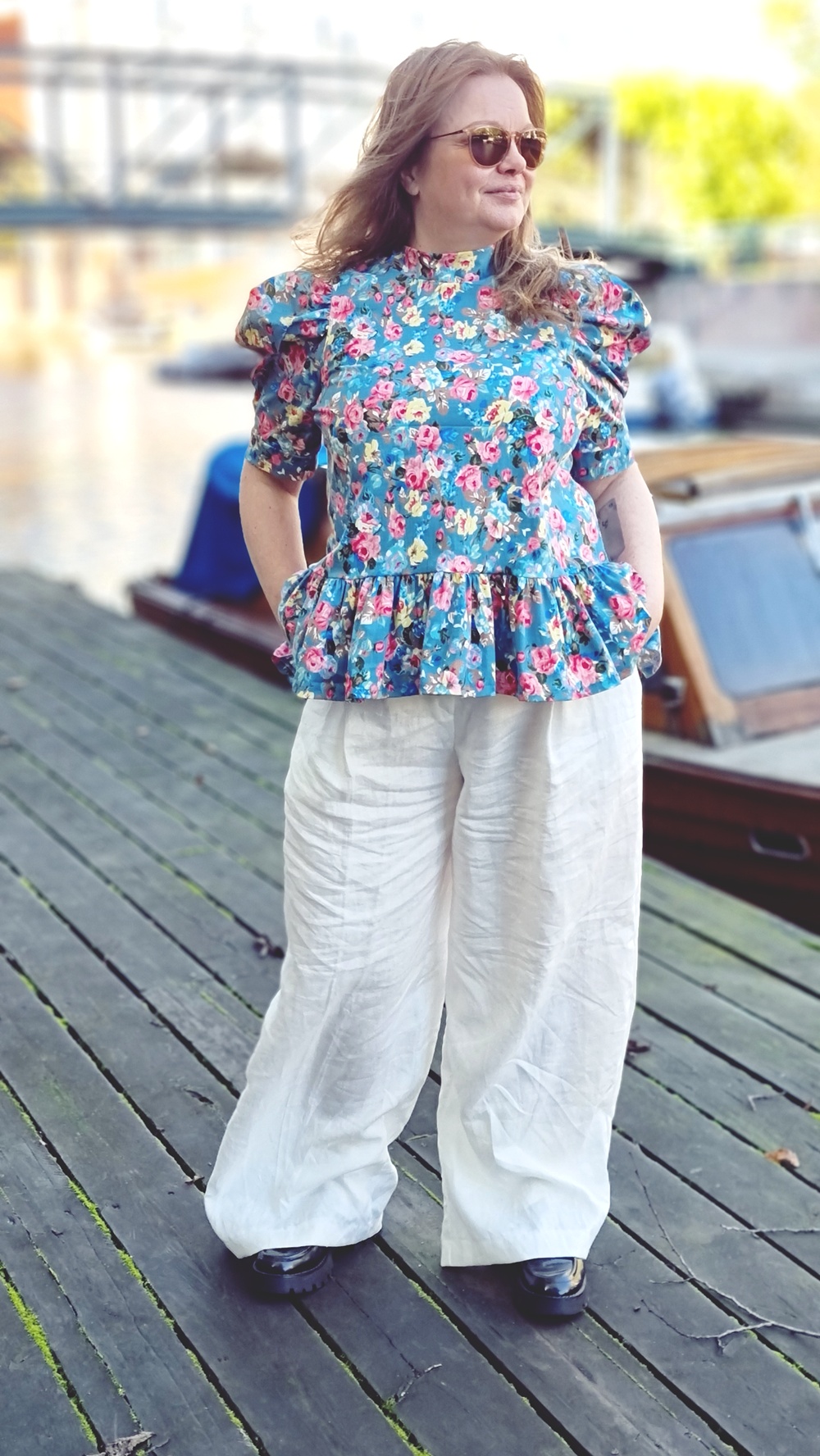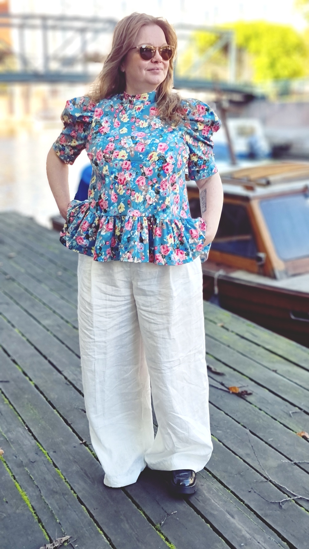 Aamupalan jälkeen jatkoimme kävelyä pitkin sataman reunaa, jonka varrelle vanhat varastorakennukset ja veneet luovat omanlaisen rytminsä. Tuuli tarttui hiuksiin ja lievitti syksyn lämmön ja viileyden välimaastossa. Päälle olin valinnut itse ompelemani asun, kokonaisuuden, jossa on palanen historiaa ja ripaus romanttista hulluutta.