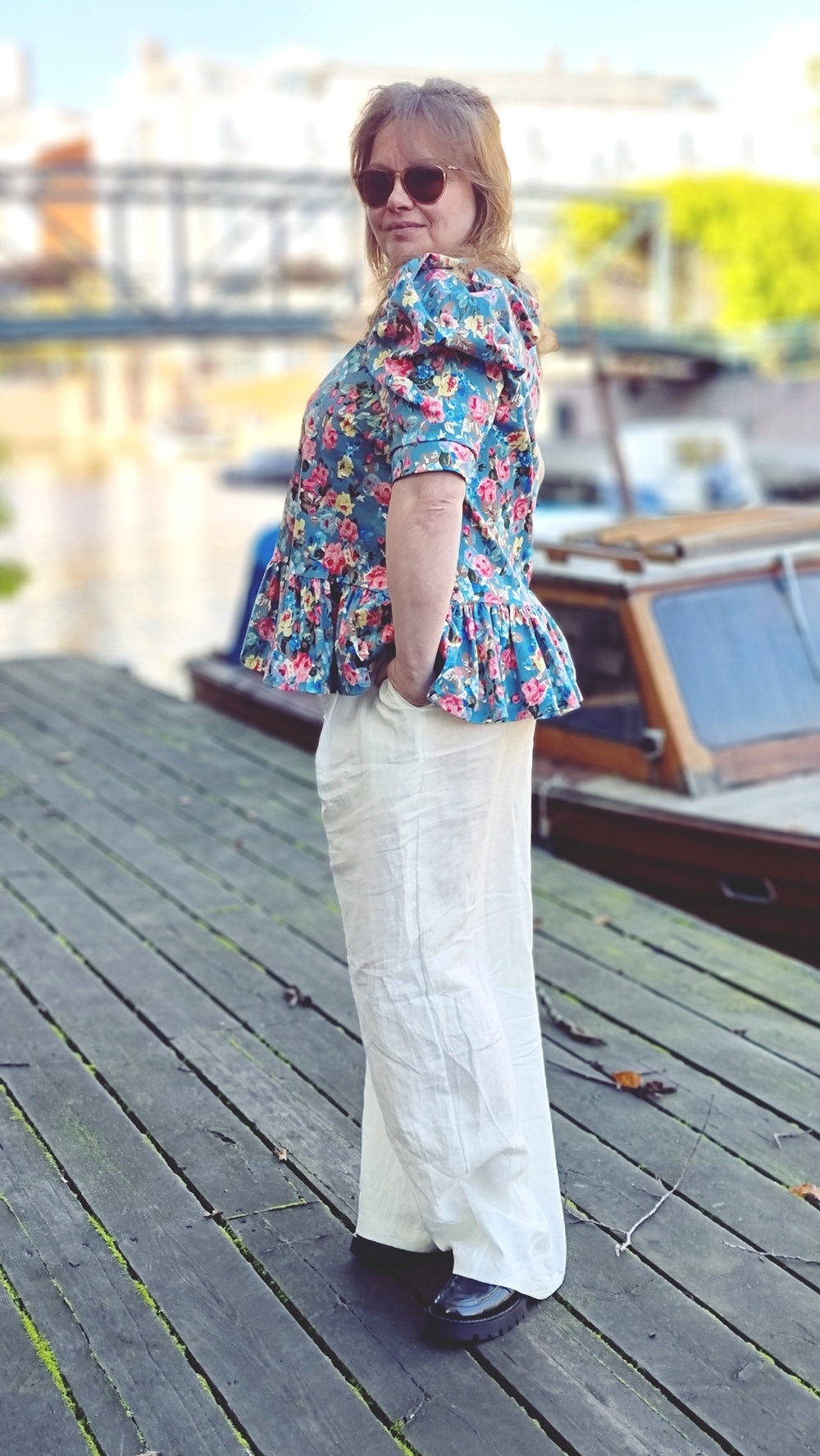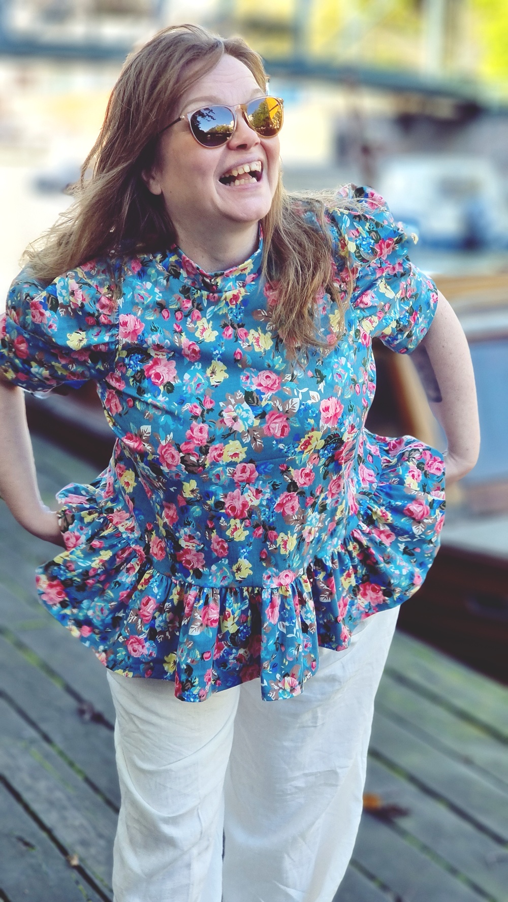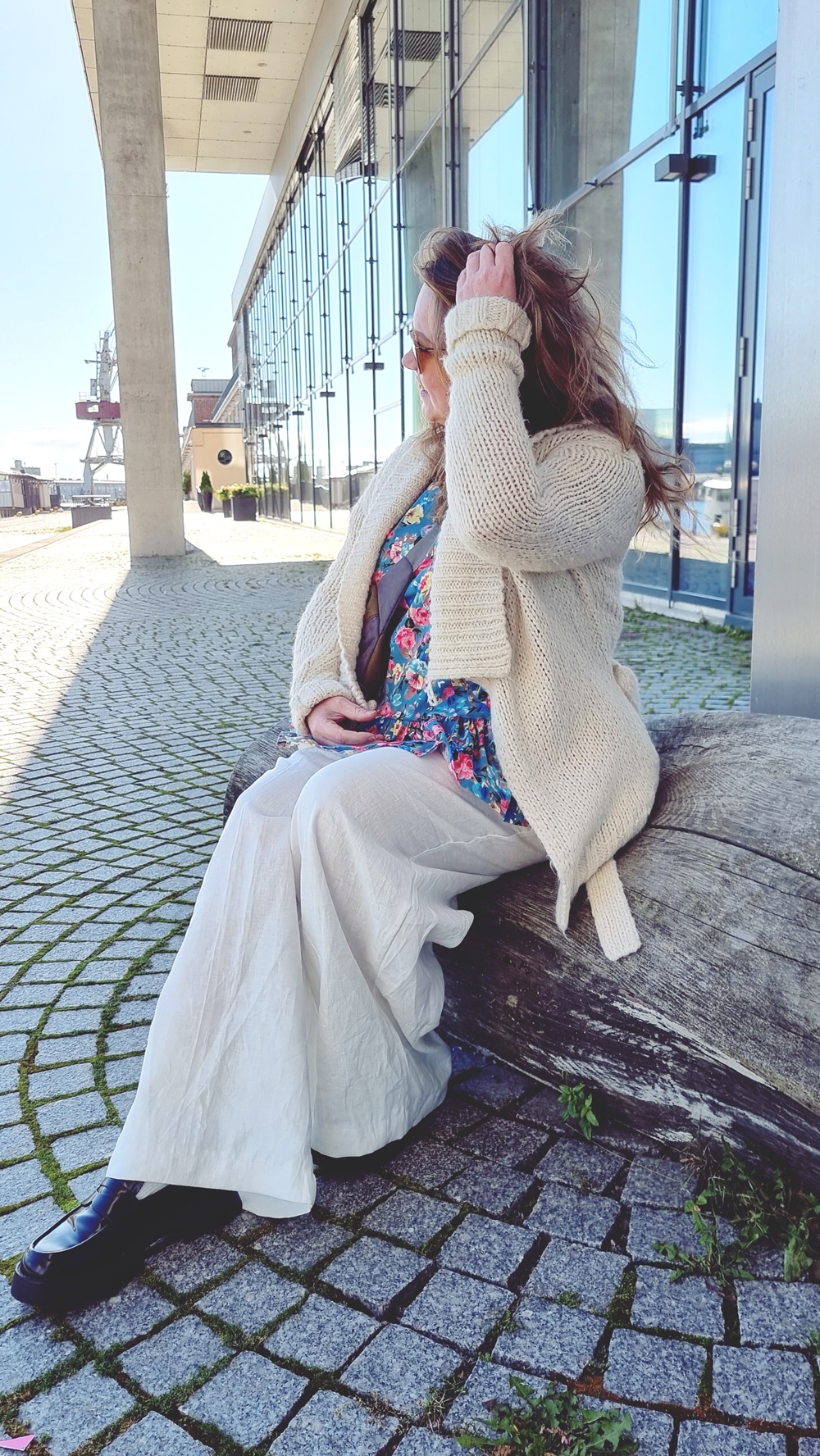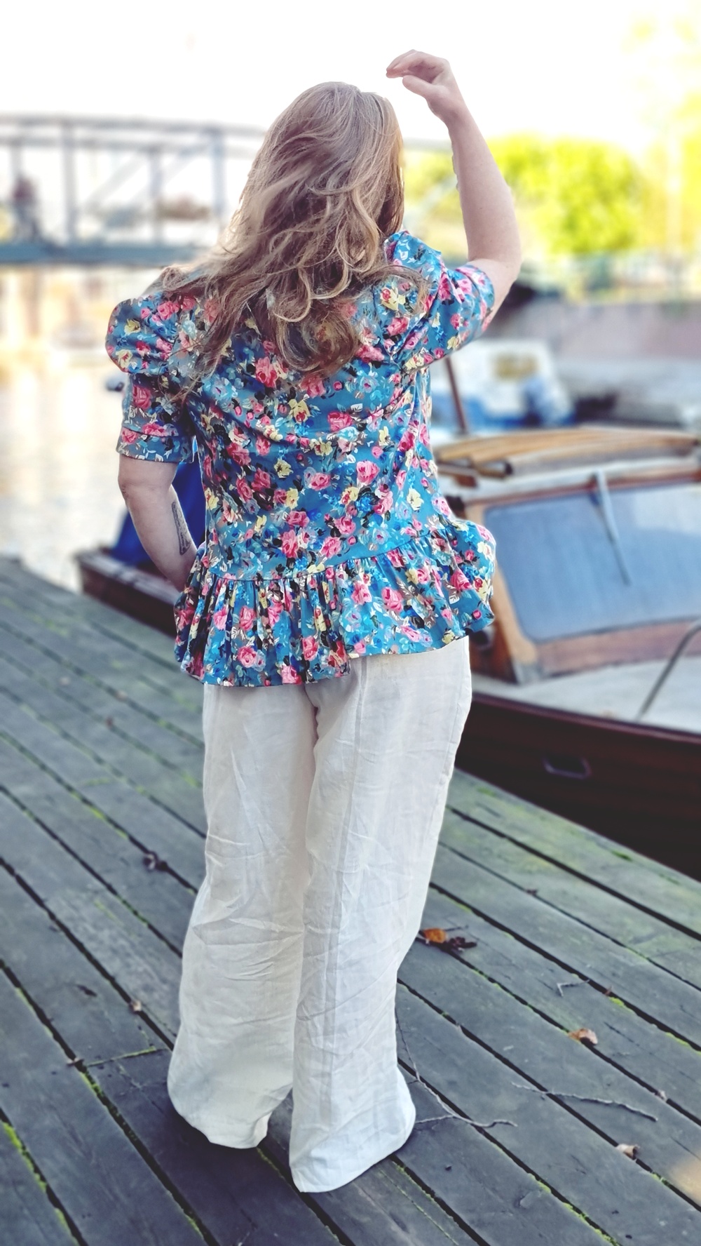 Aamupalan jälkeen jatkoimme kävelyä pitkin sataman reunaa, jonka varrelle vanhat varastorakennukset ja veneet luovat omanlaisen rytminsä. Tuuli tarttui hiuksiin ja lievitti syksyn lämmön ja viileyden välimaastossa. Päälle olin valinnut itse ompelemani asun, kokonaisuuden, jossa on palanen historiaa ja ripaus romanttista hulluutta.