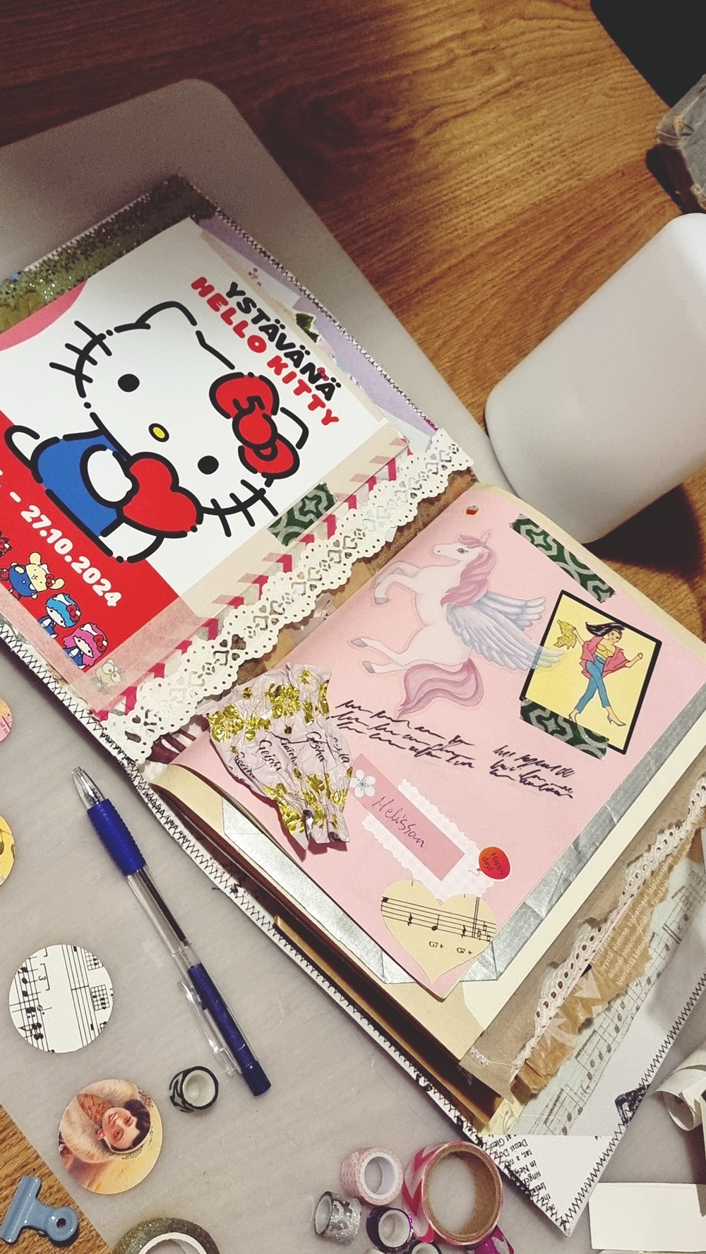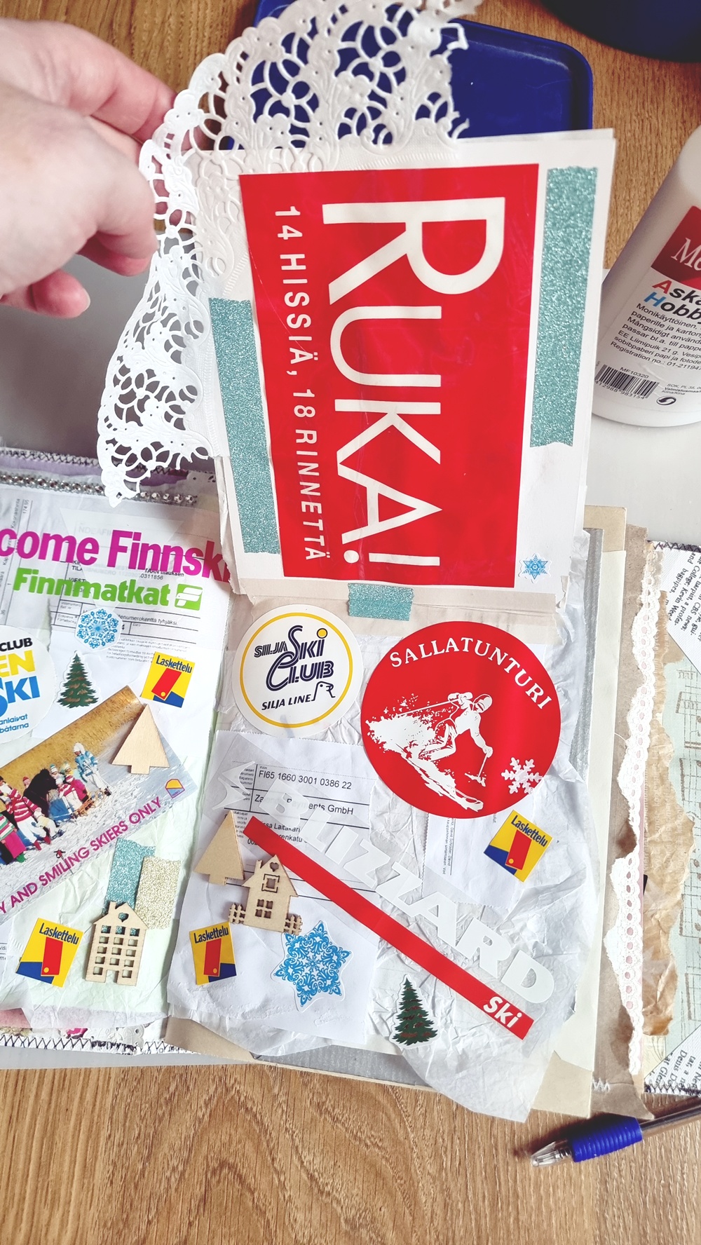 - Junk journalissa saa liimata väärin, kirjoittaa huonolla käsialalla, sotkea teippiä vinoon ja repiä papereita ilman päämäärää. Tämä vapauttaa mielen “valmiin työn” vaatimuksesta.