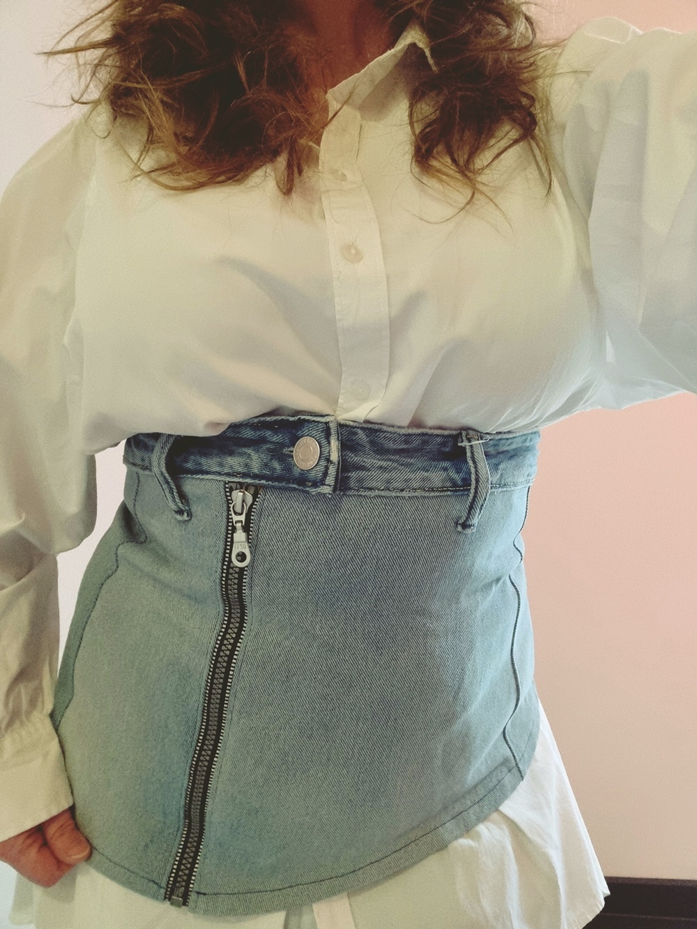 Keskipisteenä on farkkuvyö, joka on saanut uuden elämän vanhoista housuista. Super leveä, vetoketjullinen ja häpeilemättömän omaperäinen, sellainen vaate, joka ei pyydä huomiota, vaan saa sen automaattisesti.