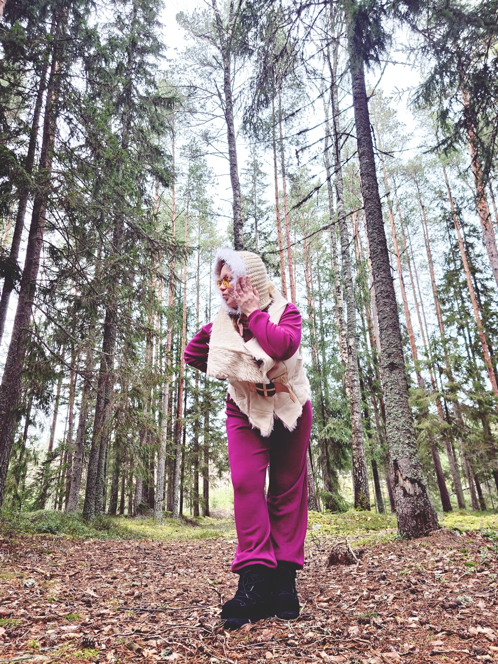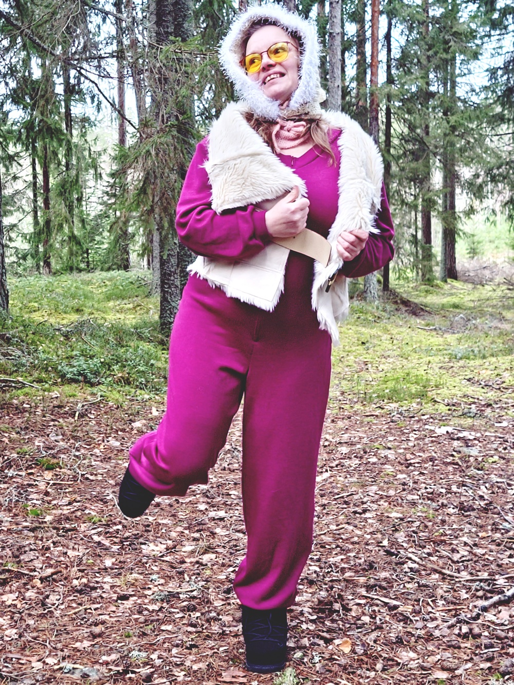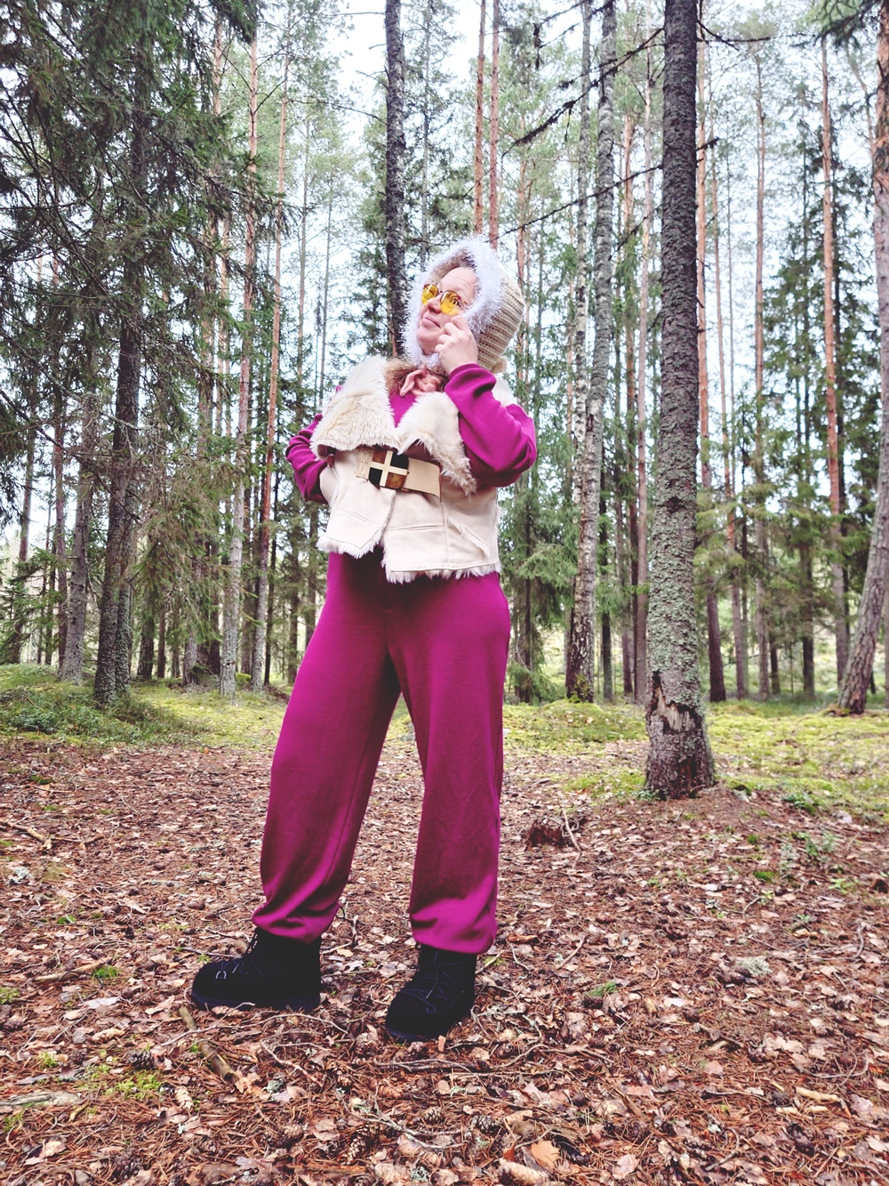 Laskettelu oli unta vain. Ei rinteitä, ei hissejä, ei sitä tuttua suksen suhinan ääntä. Mutta ehkä juuri siksi tämä asu syntyi. Kun ulkoinen talvi puuttuu, sisäinen talvi rakennetaan villasta, neuleista ja huumorista. Metsä toimi näyttämönä: askel kerrallaan, naurun kanssa, ilman kiirettä. Tämä ei ollut pettymys, vaan muistutus siitä, että joulu ei ole säästä kiinni. Se on hetkissä, käsissä ja siinä, että tekee itse jotain kaunista.