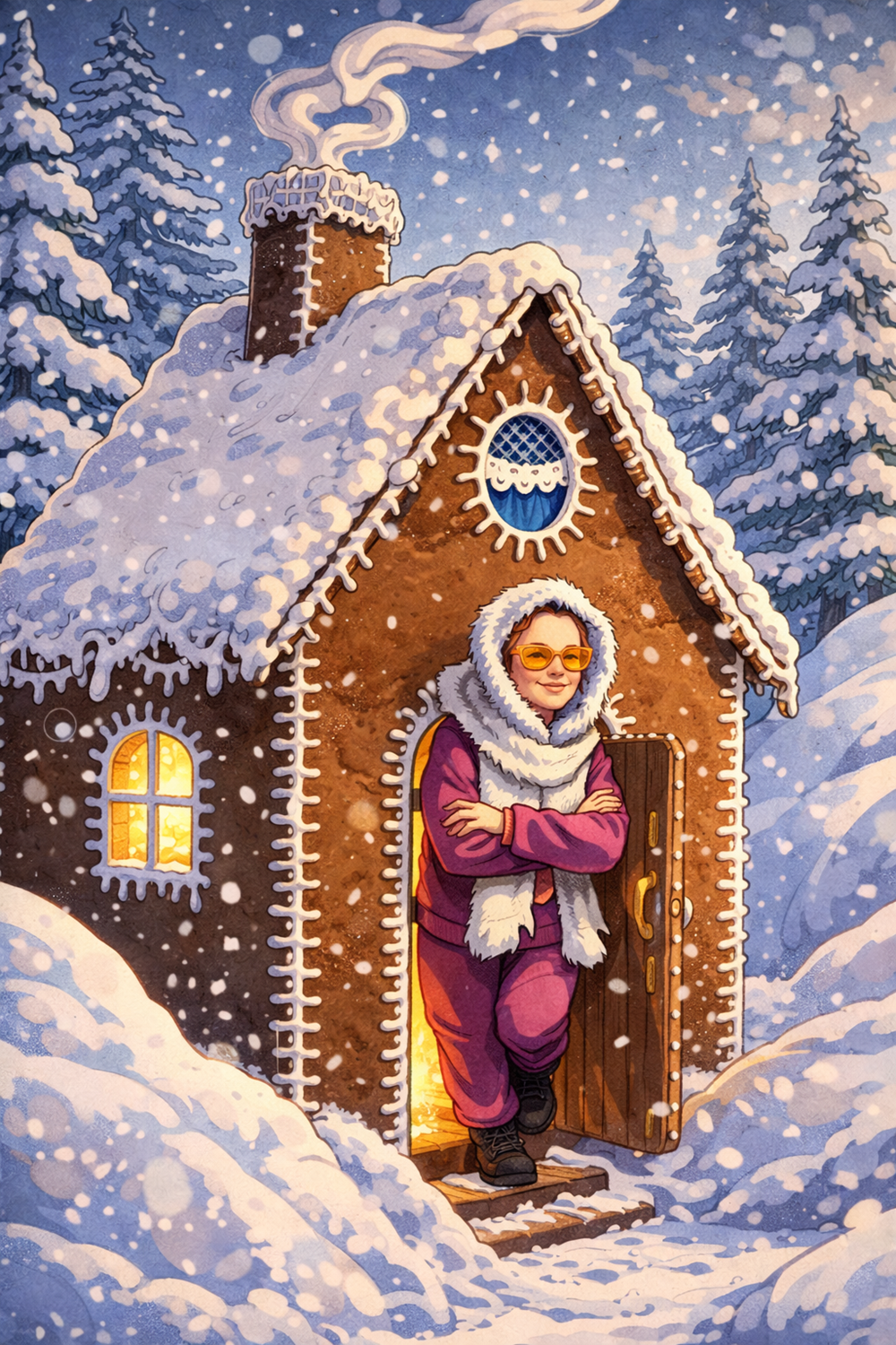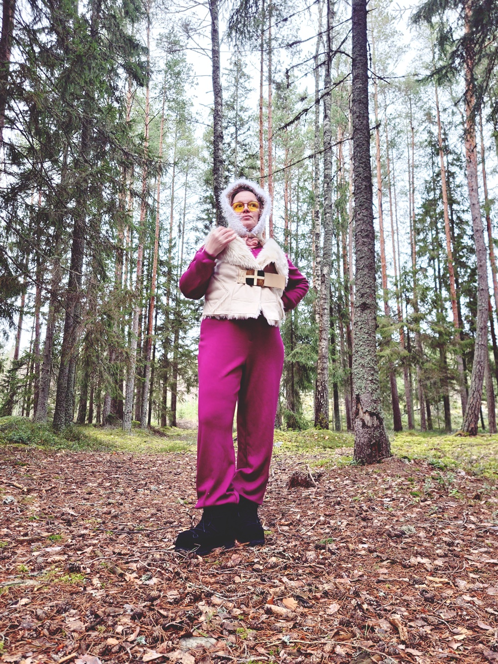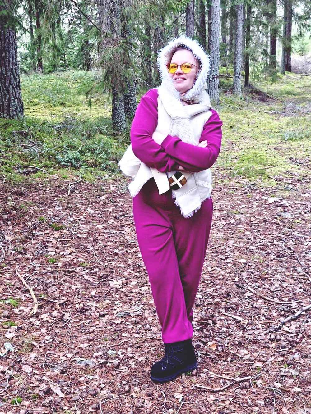 Laskettelu oli unta vain. Ei rinteitä, ei hissejä, ei sitä tuttua suksen suhinan ääntä. Mutta ehkä juuri siksi tämä asu syntyi. Kun ulkoinen talvi puuttuu, sisäinen talvi rakennetaan villasta, neuleista ja huumorista. Metsä toimi näyttämönä: askel kerrallaan, naurun kanssa, ilman kiirettä. Tämä ei ollut pettymys, vaan muistutus siitä, että joulu ei ole säästä kiinni. Se on hetkissä, käsissä ja siinä, että tekee itse jotain kaunista.
