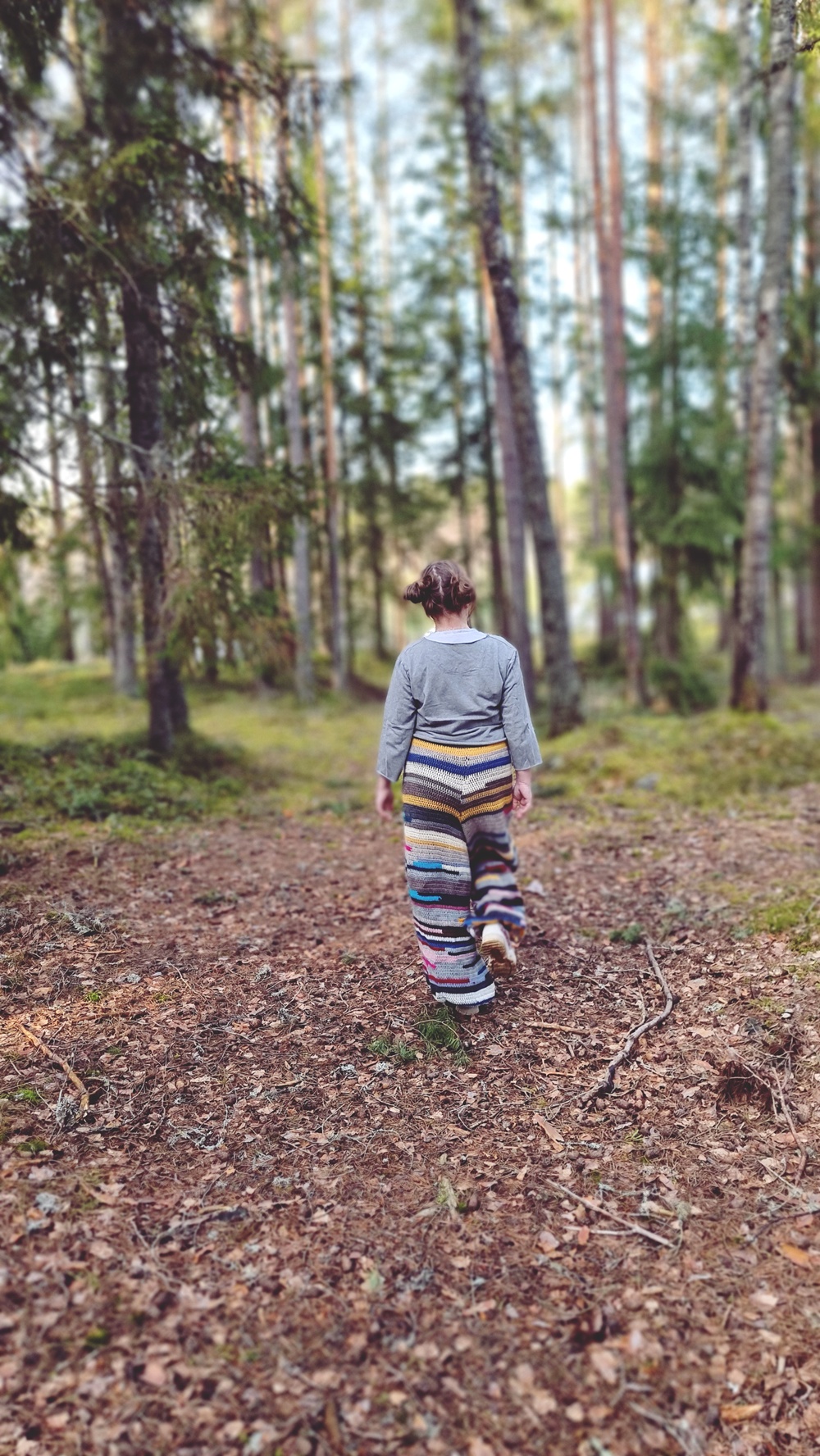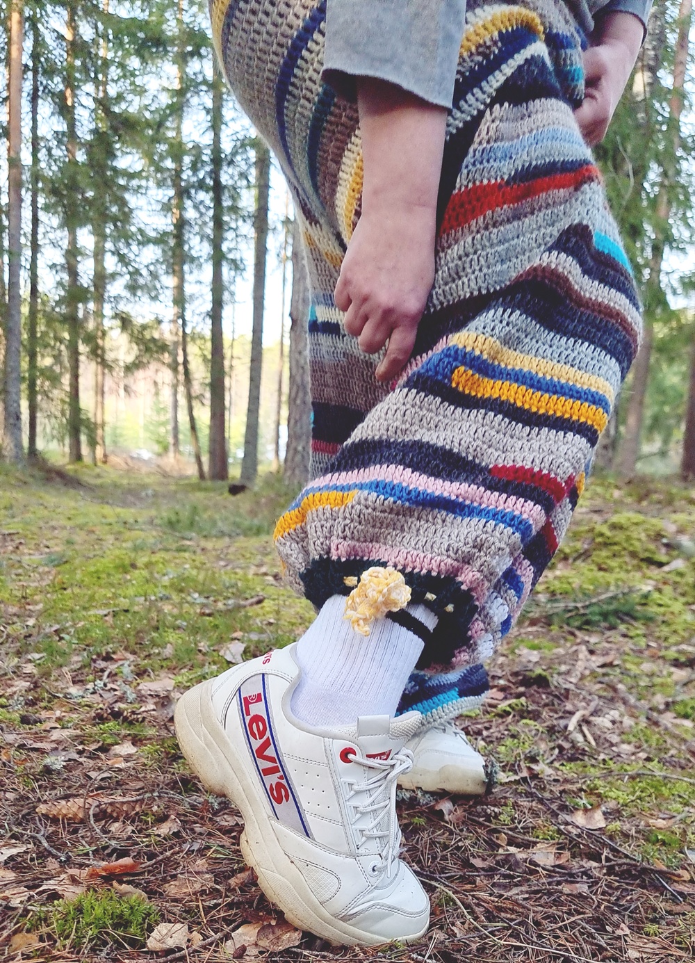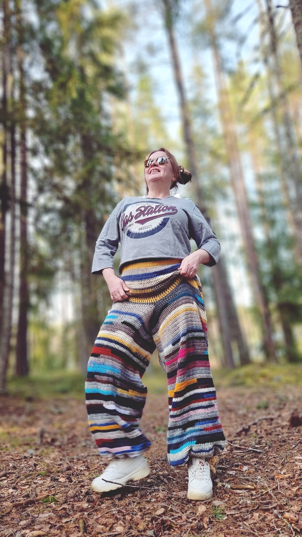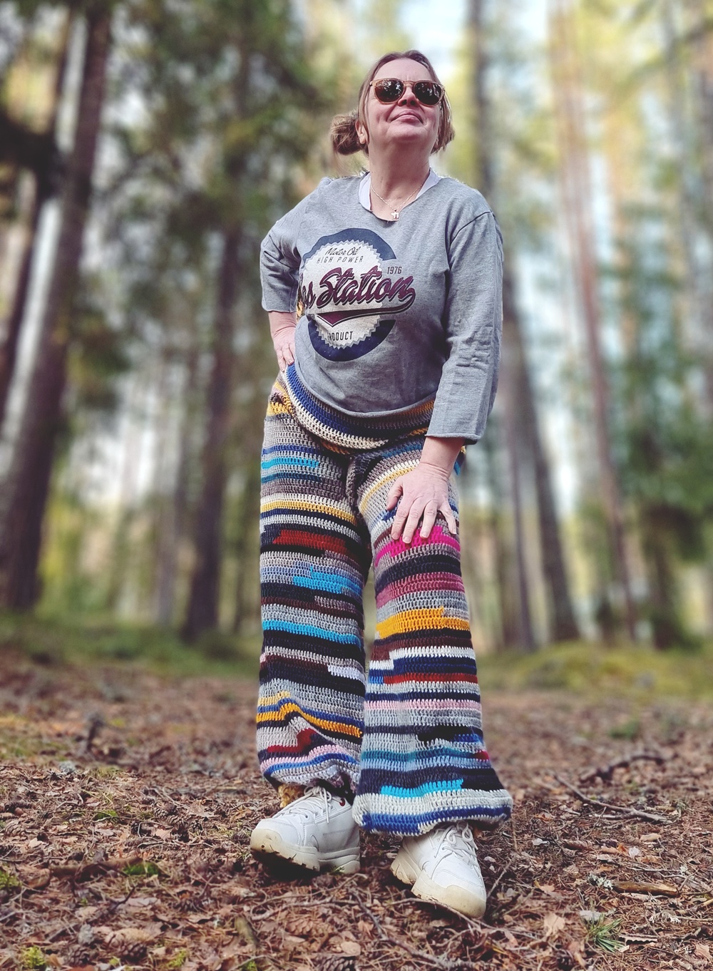 Usein käsitöissä puhutaan ajattomuudesta, hillityistä sävyistä ja “helposti yhdisteltävistä vaatteista”. Tämä ei ole sitä. Tämä on täydellinen vastakohta. Näissä housuissa ei ole mitään hillittyä. Raidat menevät miten sattuu, värit vaihtuvat ilman logiikkaa ja silti kokonaisuus toimii. Tai ainakin minä päätän, että se toimii ja se on ehkä tärkein tyylisääntö, jonka olen oppinut.