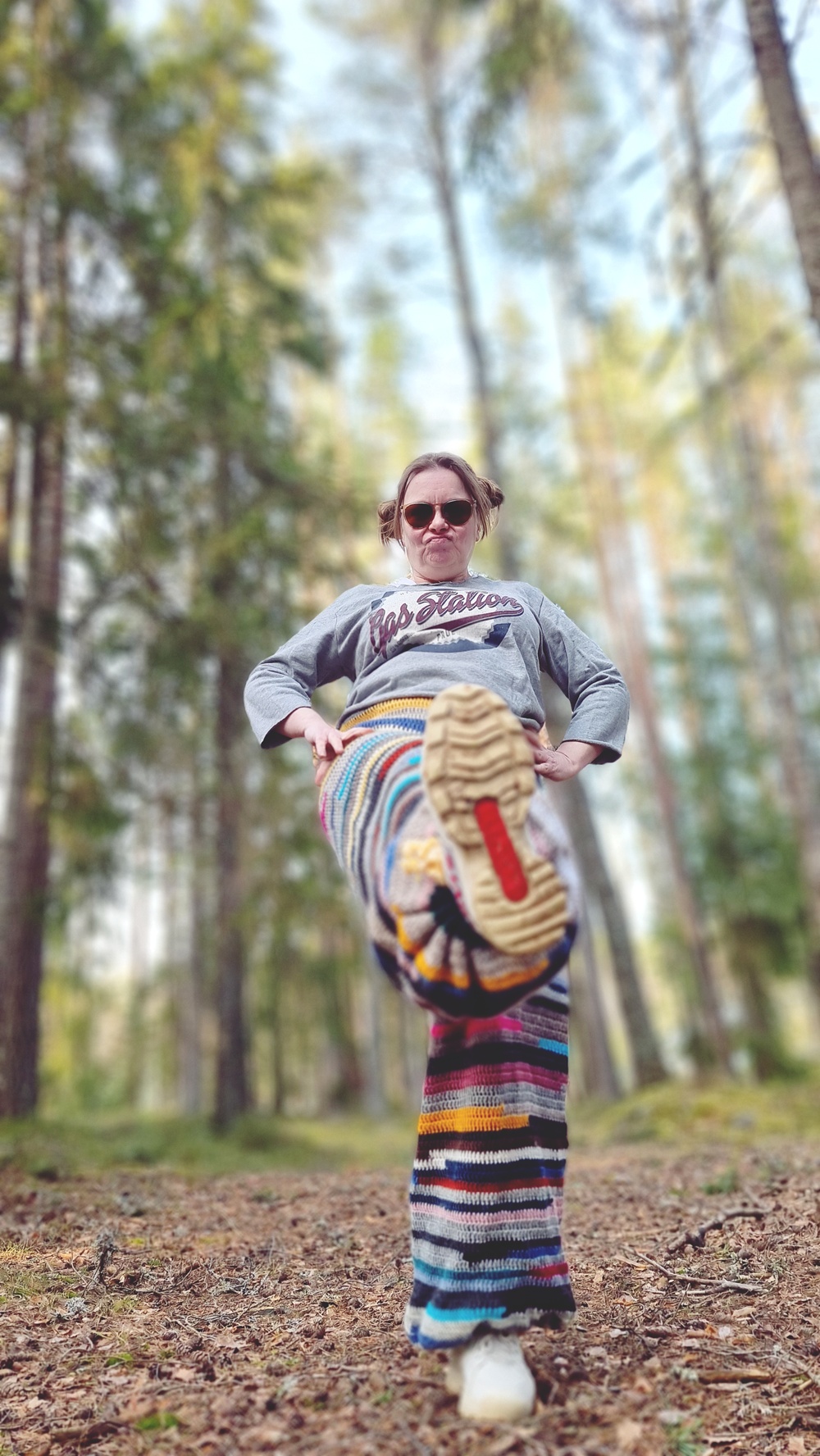 Ehkä tärkein oppi on tämä: kaikkea ei tarvitse tehdä “järkevästi”. Kaiken ei tarvitse olla minimalistista, ajatonta tai helposti yhdisteltävää. Joskus voi tehdä housut, jotka näyttävät siltä kuin lankakori olisi räjähtänyt ja silti olla niistä ylpeä. Tai ehkä juuri siksi olla ylpeä. Ja jos joku kysyy, miksi ihmeessä tein tällaiset housut, vastaus on yksinkertainen: koska pystyin.
