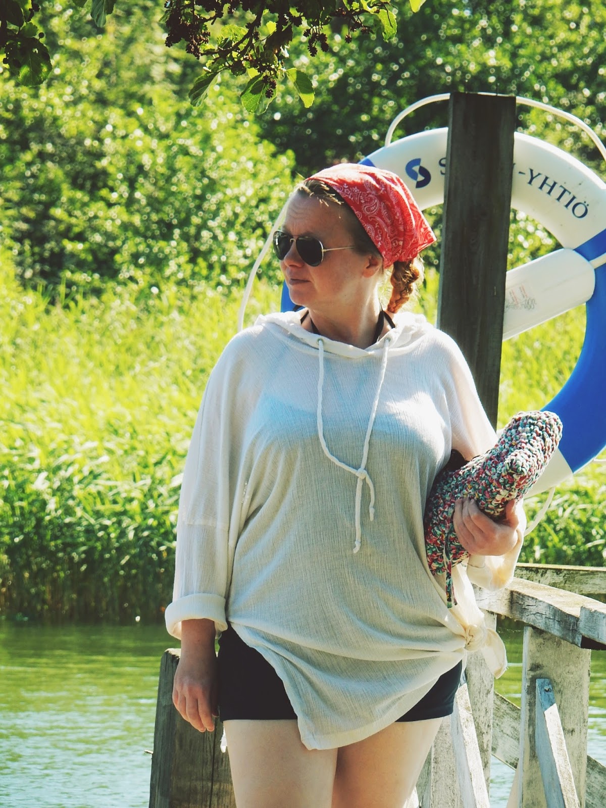 Kun onnistuin polttamaan itseäni ”Island hopping”- retkellä niin päälleni sujautin ihanan viileän hupullisen tunikan, loistava juuri tälle reissulle ja jalkaan mikroshortsit, jotka on erittäin helppo tehdä omien leggareita apuna käyttäen. Tunikan kaavan löytää Moda 3/11 lehdestä. Kangas on ihanan ohutta ja viileää materiaalia. Täydelliset vetimet tälle reissulle. Mukana keikkui myös virkattu pyöräkassi, jonka tein jo viime vuonna.