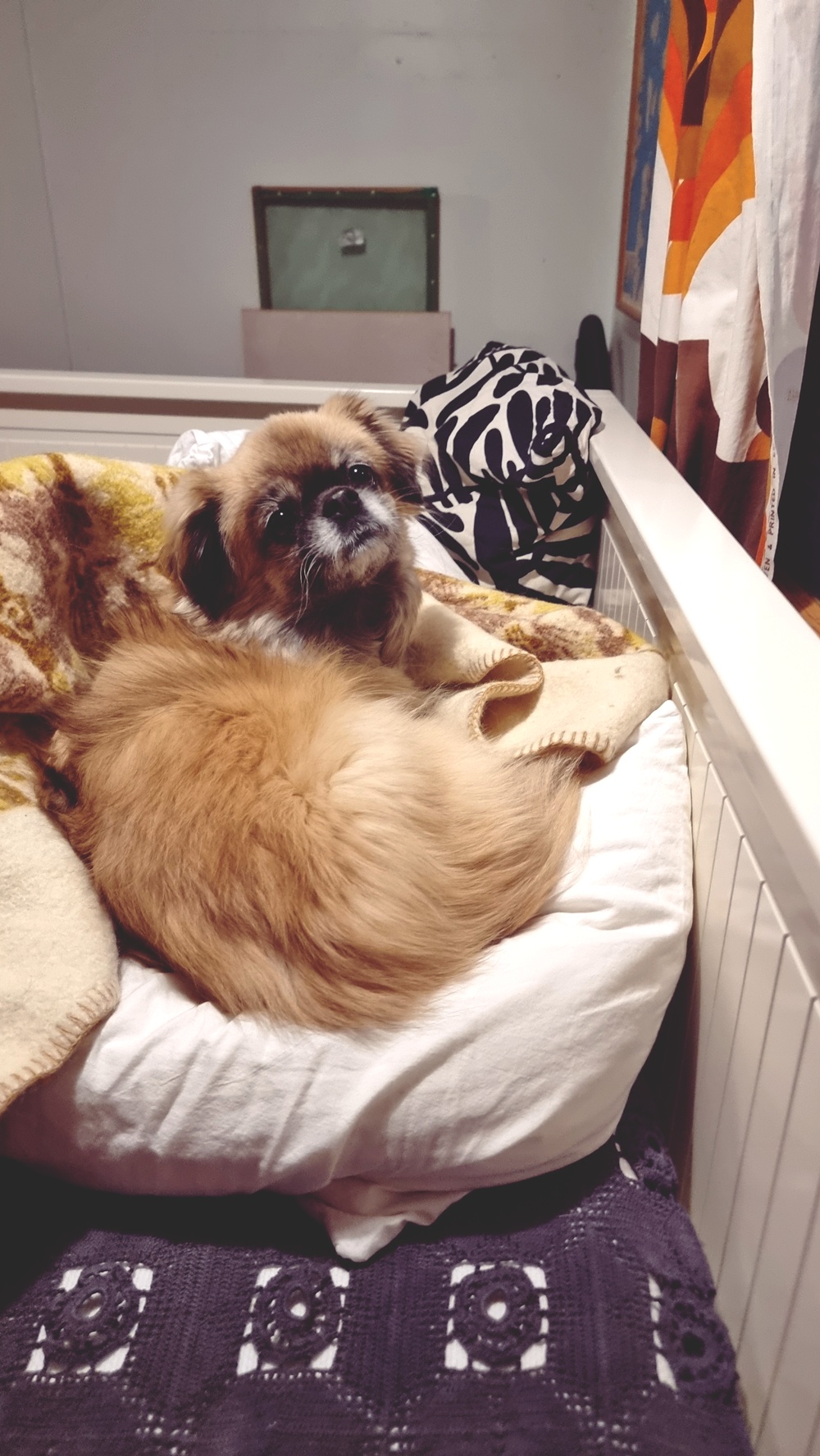 Levitimme sohvat sängyiksi, Söpö pääsi vielä asioille pihalle. Mitään lenkkiä ei uskallettu säkkipimeässä lähteä tekemään. Vain nopea ”nurkan takana” käynti ja äkkiä lämpimään tupaan.