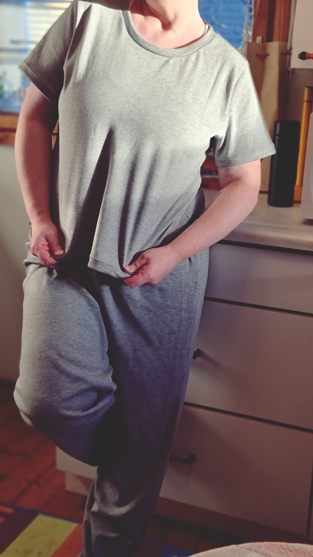 Aamun aikana otin kuvia harmaasta puvusta, jonka olen itse tehnyt. Se on yksinkertainen ja mukava, juuri mökkiin sopiva vaate. Sellainen, jossa voi siivota, saunoa ja istua iltaa ilman että tarvitsee ajatella pukeutumista. Käsintehty vaate tuntuu mökillä erityisen oikealta, kuin se kuuluisi luontevammin hitaaseen aikaan. Ei ollut tarvetta täyttää iltaa ohjelmalla, riitti että olimme paikalla.