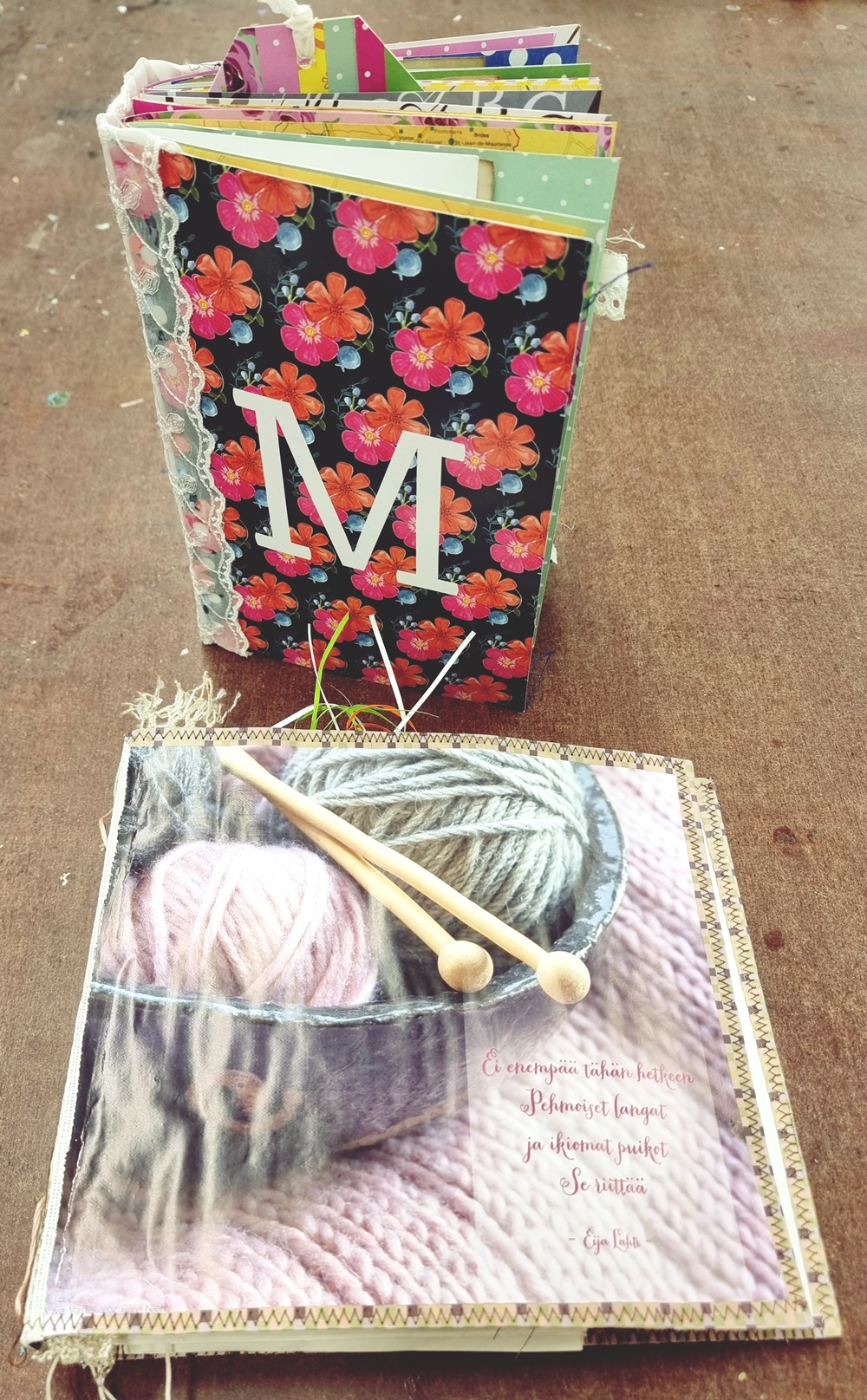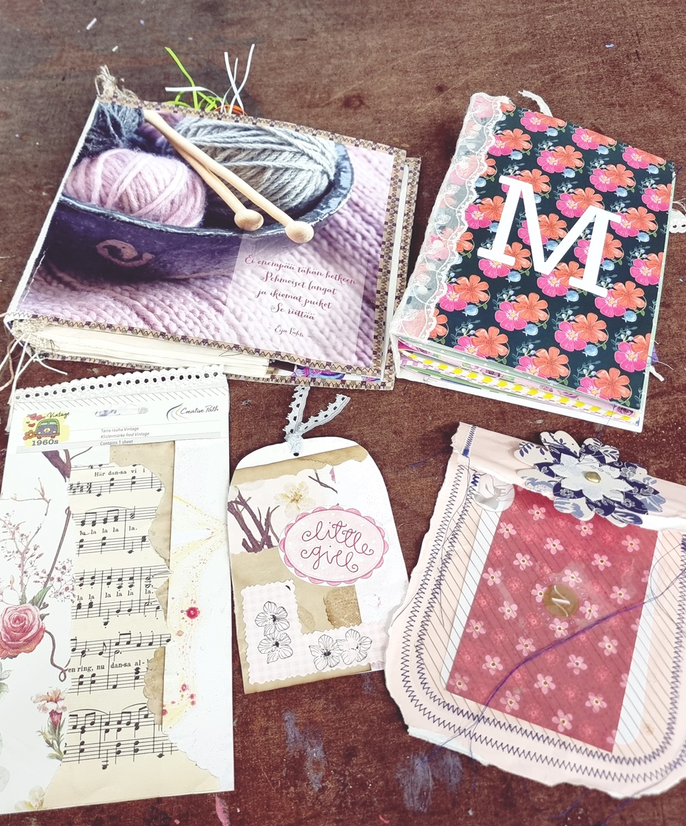 Nämä ihanuudet voidaan valmistaa ihan vain kaikesta siitä, mitä nyt sattuu kotona olemaan. Ei tarvitse ostaa mitään. Ja jos ostaa, niin paras paikka ostaa on Kierrätyskeskuksen Näpräosasto. Tosin itse en enää osta sieltä mitään kun materiaalia on ehkä jo vähän liikaakin. Journaleihin voi kerätä kaikki paperitavara mitä tulee postissa, erilaiset paketit, joista saa kivoja kansia, tapetit, mainoslehtiset yms. Kaikesta voi tehdä jotain kivaa.
