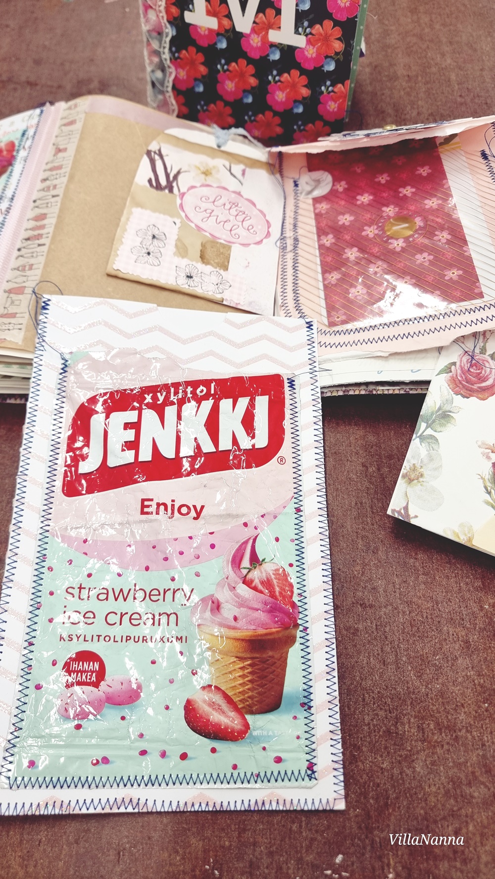 Nämä makeat junk journalit saavat sokerihampaan kutisemaan aivan varmasti. Olen tehnyt siis kaksi junkkista konvehtirasioihin. En siis päällystänyt mitään pakettia, vaan aivan suoraan raknesin kirjan konvetirasian pakkaukseen ja näistä tuli kyllä niin herkullisia. Tällainenkin tekeminen on todella hauskaa, ei vain se, että rakentaa myös kannet itse.