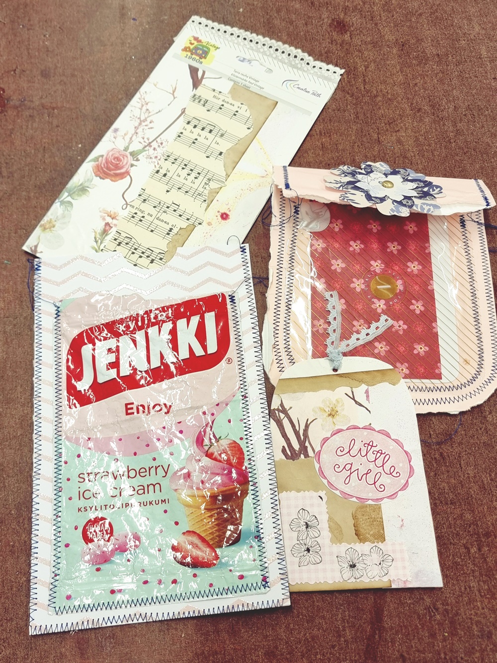 Pussukoihin taas soveltuu karkkipaperit, sipsipussit, kahvipaketit, erilaiset lehdet yms. Ja kaikki muovitetaan kotikonstein kontaktimuovilla. Vuoriksi soveltuu vaikka vanhan lakanan osat, tilkut yms. Mitä ikinä kodista löytyy. Vetoketjut itsellä on sellaisia, jotka on purettu hävitykseen menevistä vaatteista. Pyrin siis ohjaamaan nuoria siihen, että kaiken voi hyödyntää tavalla tai toisella. Nämä ovat siis tämän syksyn ehdoton hitti, joita tehtäisiin ihan koko ajan.