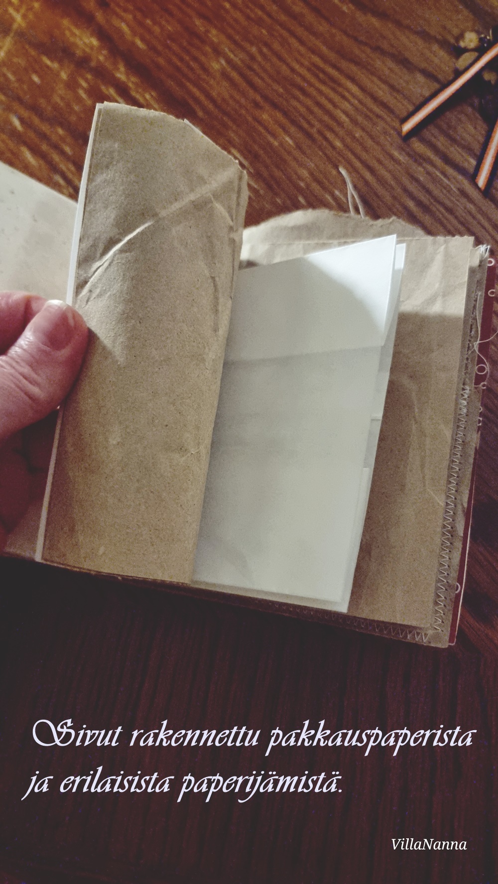 Pienemmän ns. muistion sivut on rakennettu pakkauspaperista ja isomman muistikirjan sivut on mitä sattui nyt olemaan sivuja. Mitään ei ole ostettu, kaikki on sellaista materiaalia, jota olen säästänyt ja nyt kerännyt hyllyyn. Pienemmän idea lähti siitä, että halusin saada pakettimateriaalin hyödynnettyä jotenkin järkevästi ja näin valmistui minun ensimmäinen junkkis, jossa on vain ja ainoastaan pakkauspaperia. Tämä junkkis ei ole vielä mitenkään käytössä. En edes tiedä mitä tähän oikein haluan laittaa. On muutoinkin oikeastaan aika pieni, että jotain pientä siis tähän.