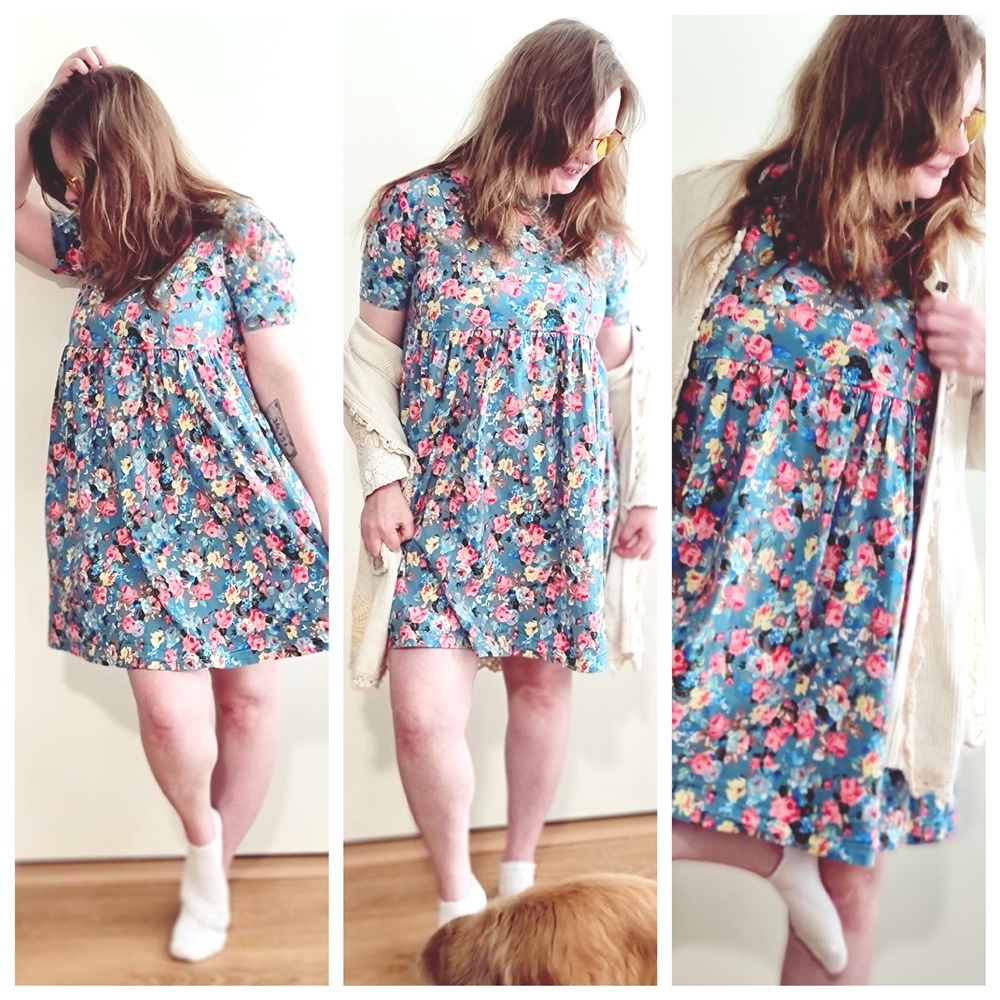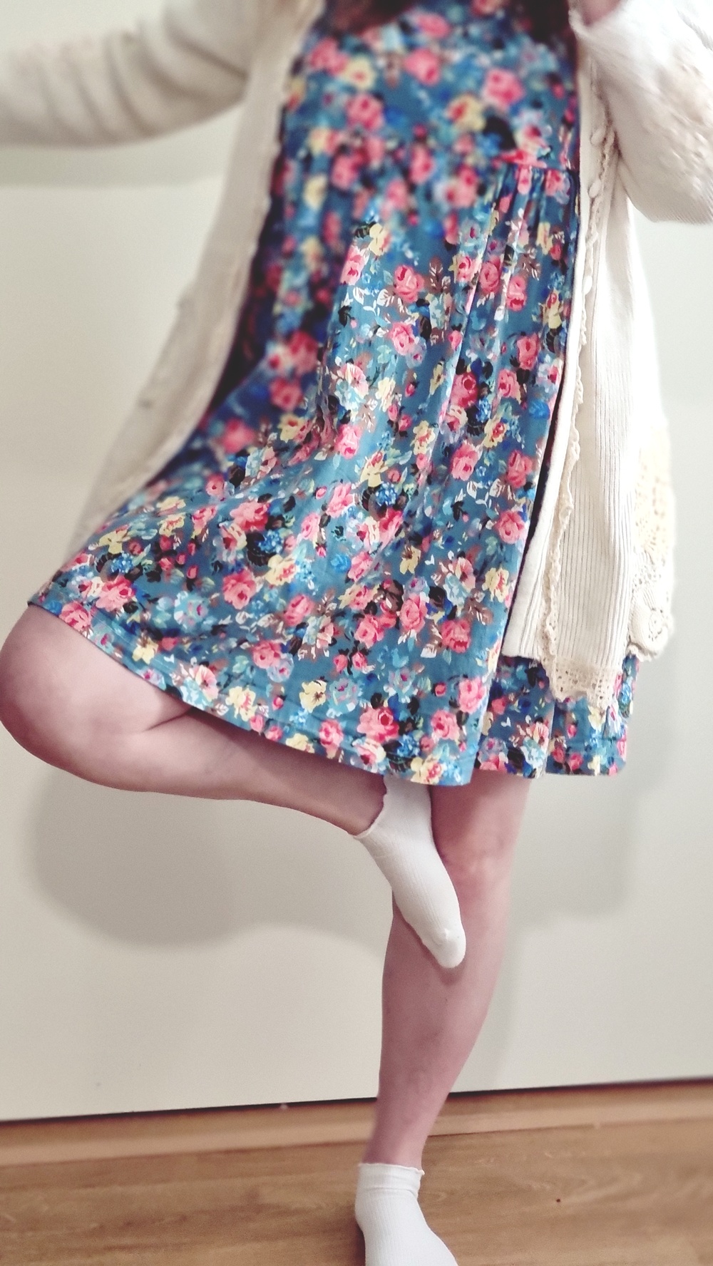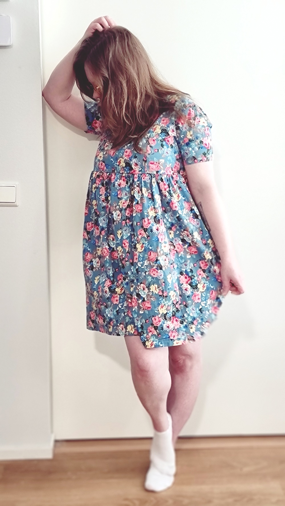Sinipohjainen kukkamekko on itse ommeltu muutama vuosi sitten. Kankaan löysin sattumalta käsityötarvikkeiden vaihtoillasta, ja siitä syntyi nopeasti lempimekkoni: kepeä, iloinen ja helppo yhdistää eri tyyleihin. Mekossa on 60-luvun henkinen kukkakuosi, joka tuo mieleen mummolan kesäpäivät, kukkaniityt ja aurinkoiset aamukahvit puutarhassa. Tämän mekon kaava on yksinkertainen, ja sen juju on juuri siinä, kuosi saa loistaa.