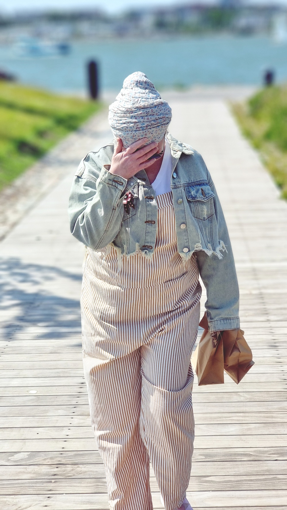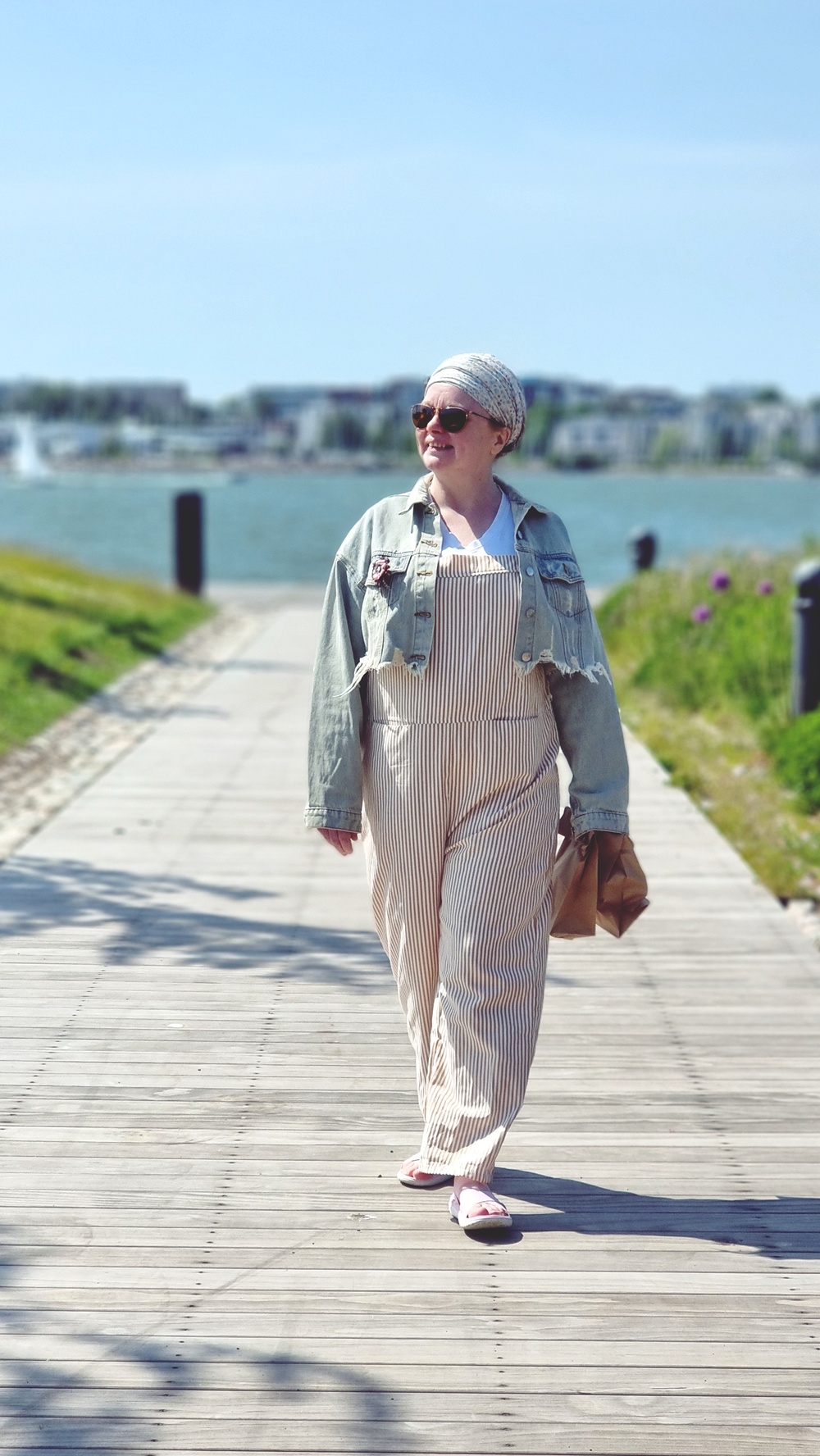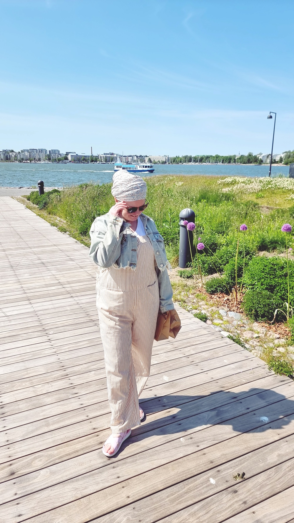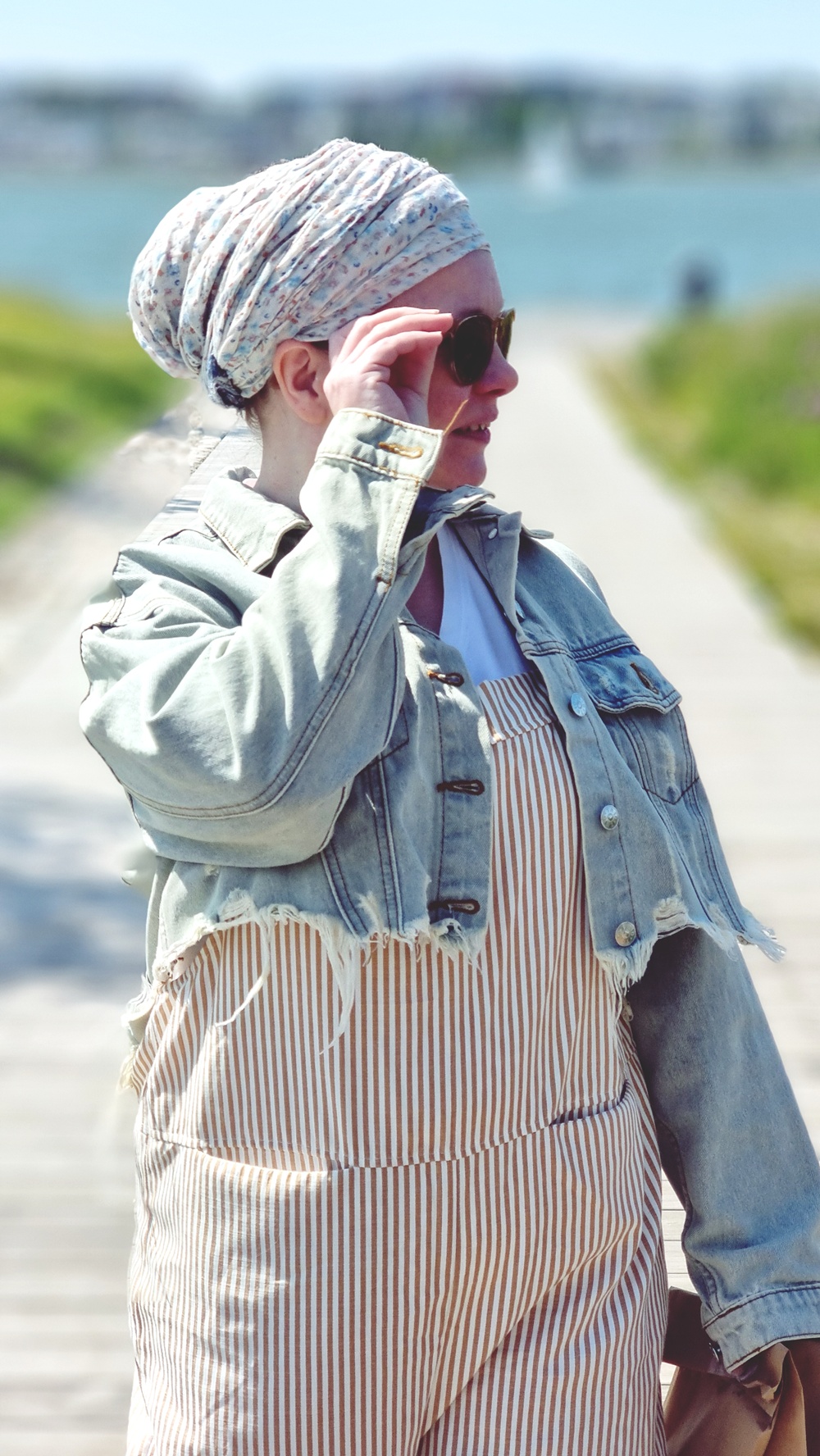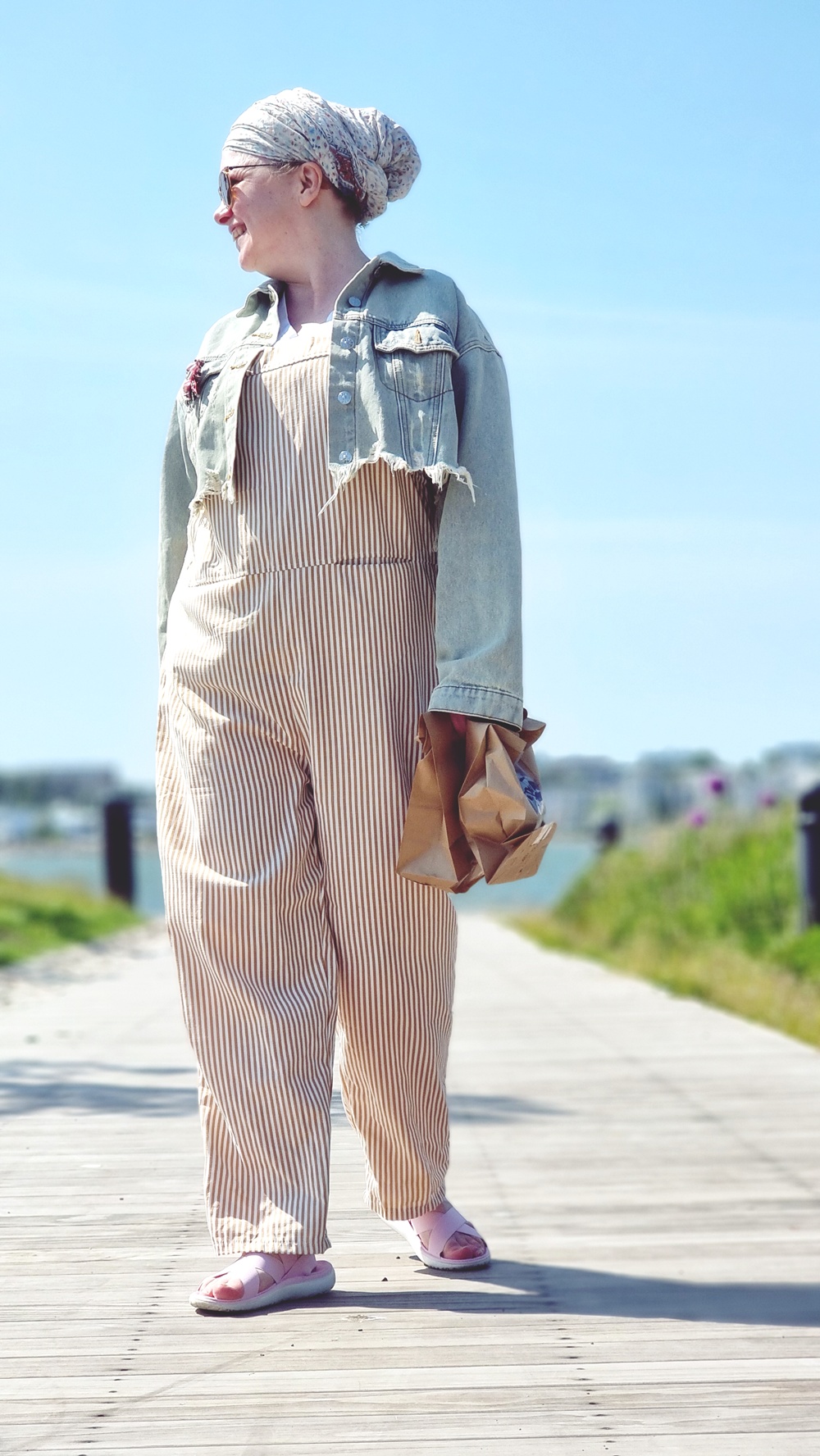 Päälläni oli UFFin rekeistä metsästetty unelmien puuvillahaalari, joka on kuin suoraan vanhan valokuvan kätköistä. Pehmeä, hieman ryppyinen kangas ja hennot beigen ja valkoisen raidat tekevät siitä kepeän ja nostalgisen, kuin lapsuuden kesäpäivä, joka tuoksuu vaniljajäätelöltä ja suolavedeltä. Se on haalari, joka ei yritä liikaa. Se vain on ja juuri siksi se hurmaa.