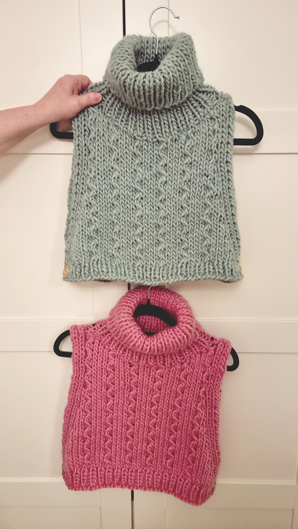 Kun ripustin kaulurit henkarille ja nostin ne kaapin ovea vasten, sydän melkein pysähtyi, siinä ne olivat, kuin kaksi pientä syksyn sielua, toinen hennon vihreänä, toinen marjaisan pinkkinä. Talvimarja-kauluri on juuri sellainen vaate, joka saa sinut haluamaan käpertyä villasukat jalassa ikkunan ääreen, sytyttää kynttilät ja keittää pannullisen teetä. Se on villapaitojen ja paksujen huivien serkku, mutta paljon käytännöllisempi: se sujahtaa pään yli ja pysyy kauniisti paikoillaan koko päivän.