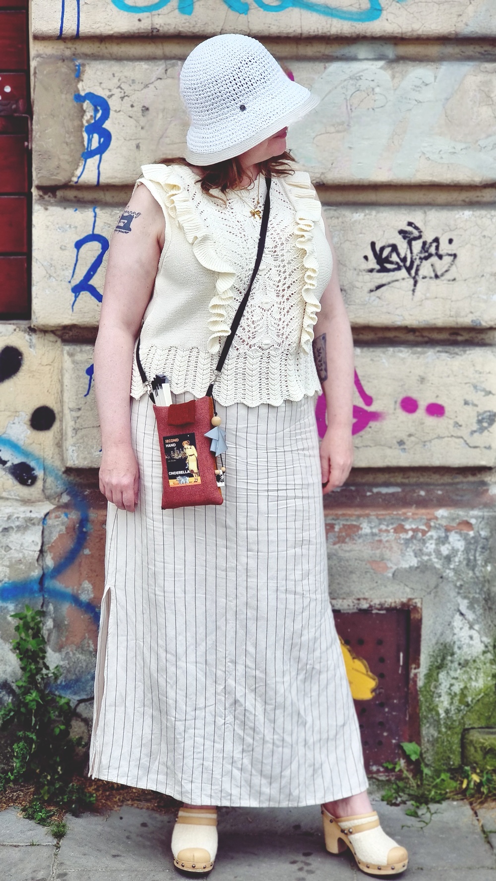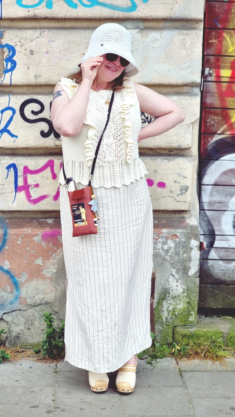 Lisävarusteet kertovat jokainen oman matkatarinansa. Käsityönä virkattu laukku on pieni ja pehmeä, juuri sopiva kantamaan puhelimen, aurinkorasvan ja muutaman euron jäätelötaukoa varten. Se tuo asuun raikkautta ja toimii samalla käsityömuodin muistutuksena. Krakovasta ostettu hattu puolestaan suojaa auringolta ja tuo ripauksen lomatunnelmaa.