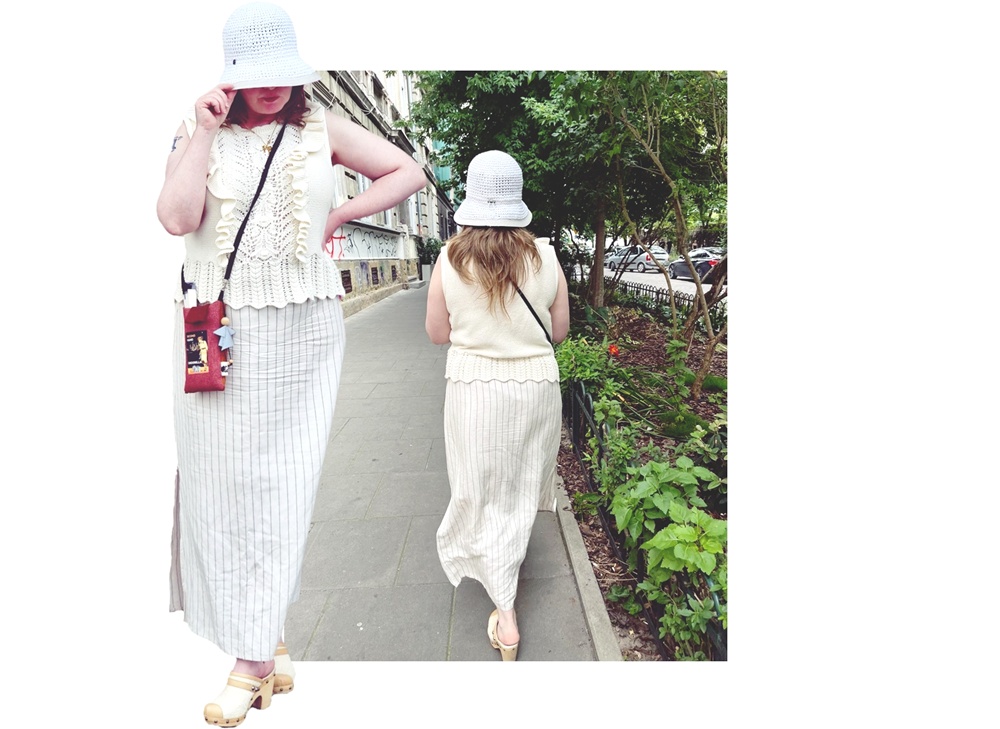 Jos pitäisi valita vain yksi kesäasu, joka kuljettaisi läpi helteisen kaupungin, rennon puistokävelyn ja jäätelötauon, se olisi tämä, kesäpäivän täydellinen yhdistelmä. Tämä kokonaisuus on kuin postikortti minusta itsestäni: kierrätettyä materiaalia, käsityötä, matkamuistoja ja ripaus rentoa luksusta, joka ei ota itseään liian vakavasti.