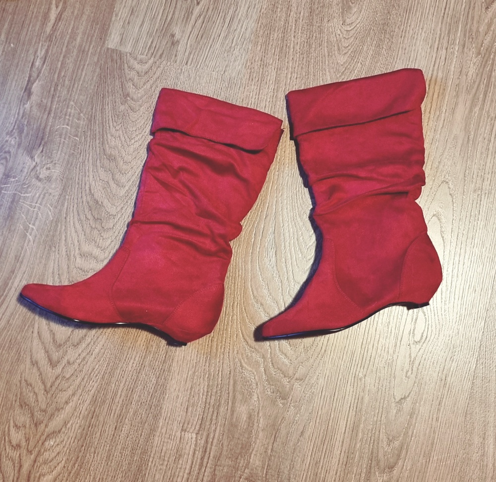 Ja sitten koitti retken kruunaava hetki. Punaiset. Täydelliset. Hieman vintagehenkiset. Pehmeät. Saapikkaat, 12 euroa. Kun näin ne, tiesin että se oli kohtalo. Sellainen hetki, jossa kirppisjumalat kuiskaavat korvaan: Ota ne. Älä kysele. Ne olivat juuri sopivasti dramaattiset, juuri sopivasti leikkisät. Täydellinen väriläiskä mihin tahansa asuun ja talven tanssikenkiä ei voi koskaan olla liikaa.