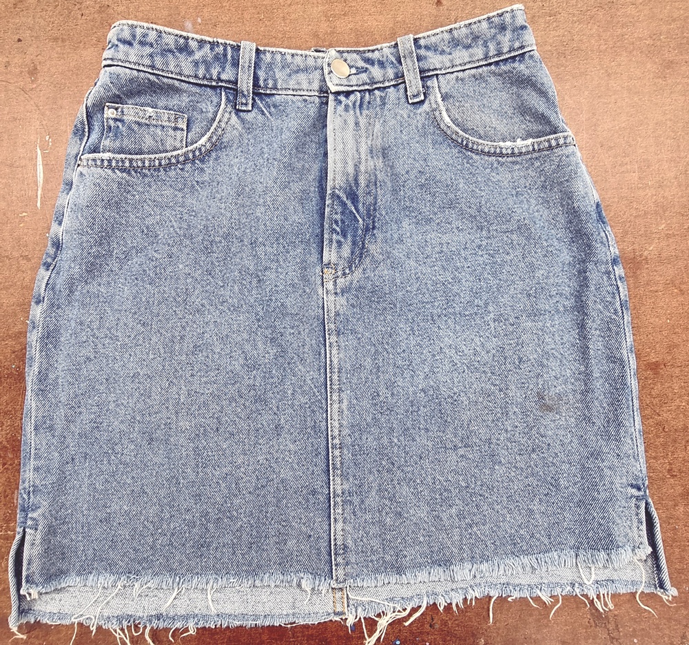 Minihame ja kahdet farkut, näistä ilmaisosaston löydöistä hame, joskus täydellinen vaate ei synny kaupasta, vaan pölyisestä kulmasta Kierrätyskeskuksen ilmaisosastolta. Tästä syntyi hame, joka ei kumartele kaavoja eikä sääntöjä.
