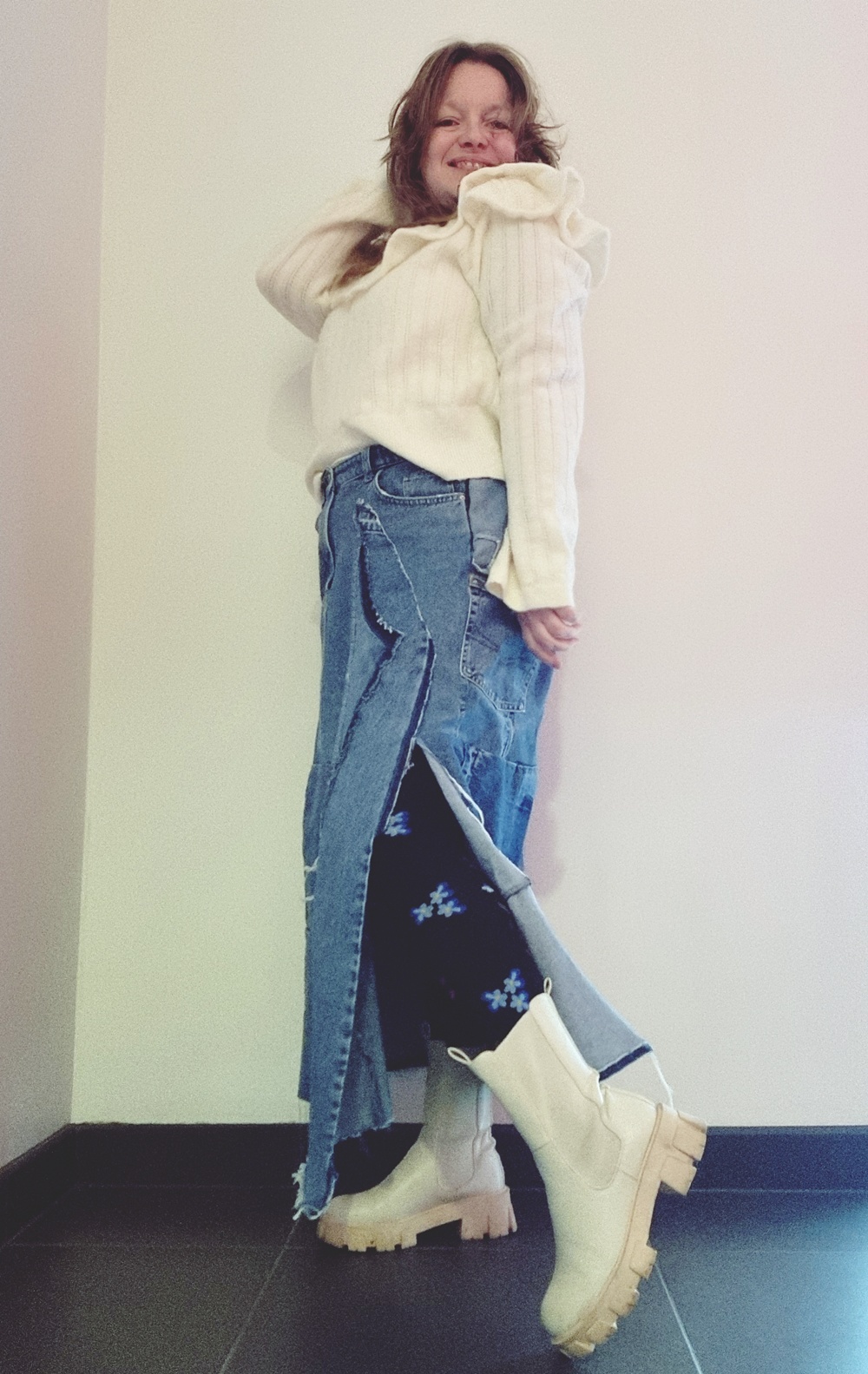 Jalassa kerros kerroksen päällä: itse tehty farkkuhame, kukkakuvioiset sukkikset ja vaaleat maiharit, jotka eivät kysy lupaa astua kuraiselle kadulle. Koko asu huokuu samaa energiaa kuin hame itse, vapautta, tarinallisuutta ja pientä hulluutta.