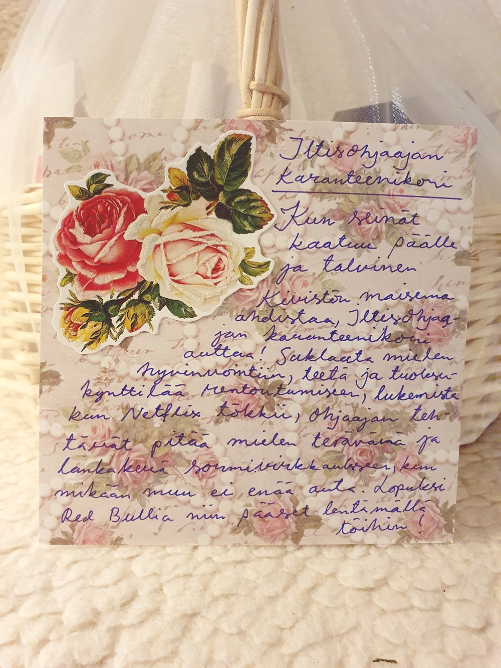 Korin voi tehdä ihan niin ekologiseksi kuin haluaa, tämä oli puolittain, sillä haluttiin kuulla myös lahjan saajaa, mitä haluaa, mitä on vailla ja mikä piristäisi.