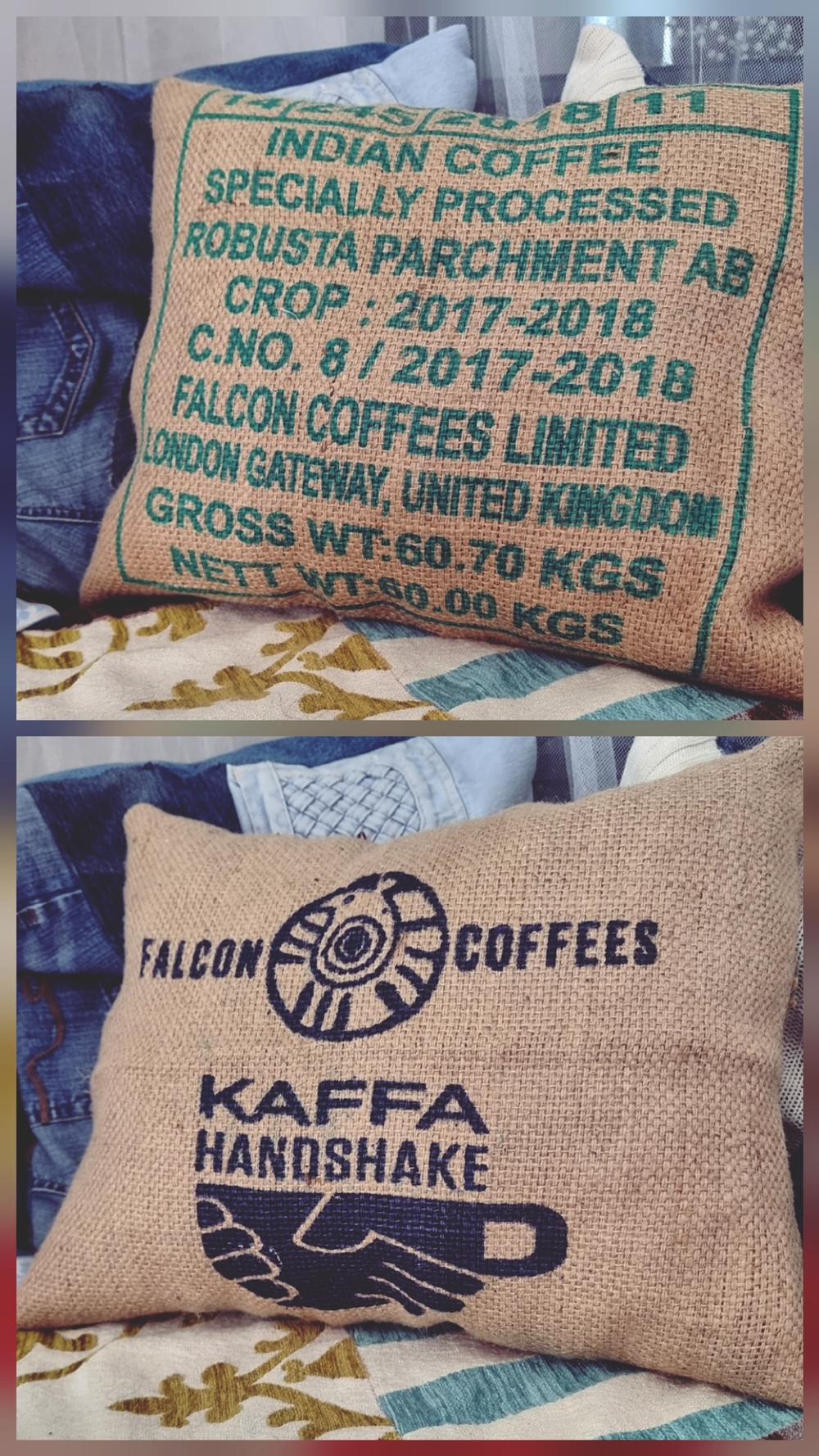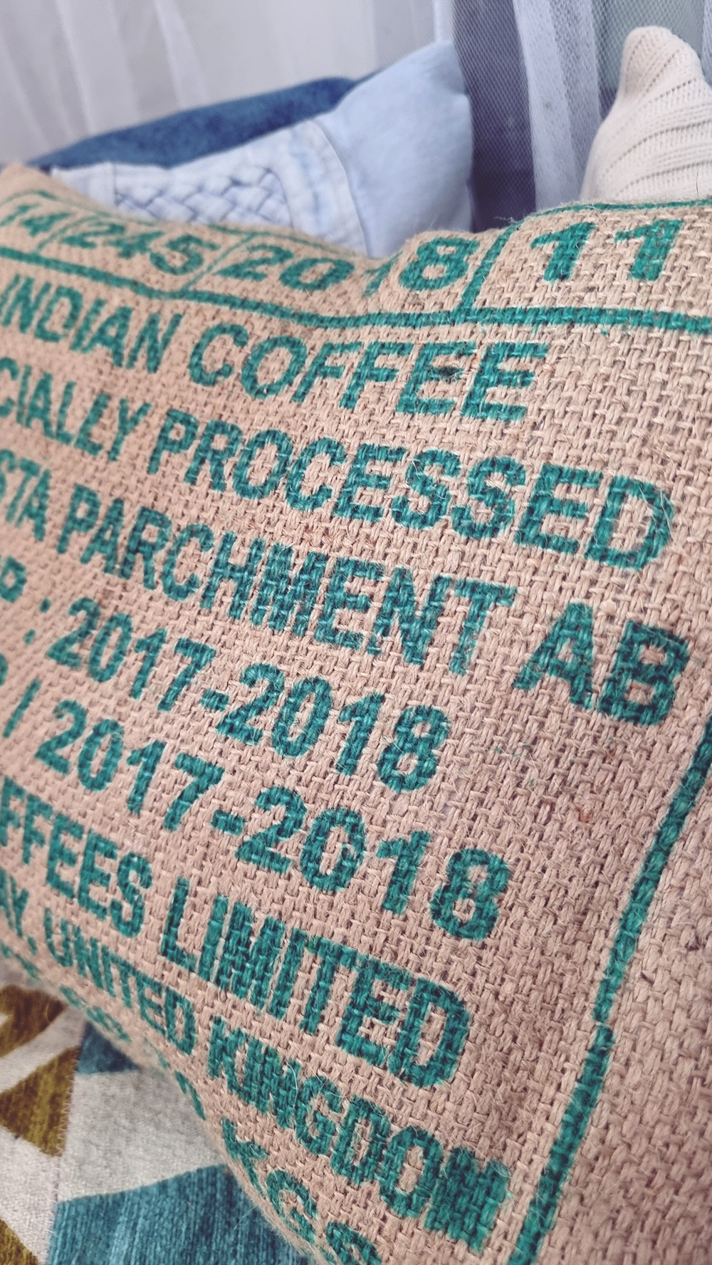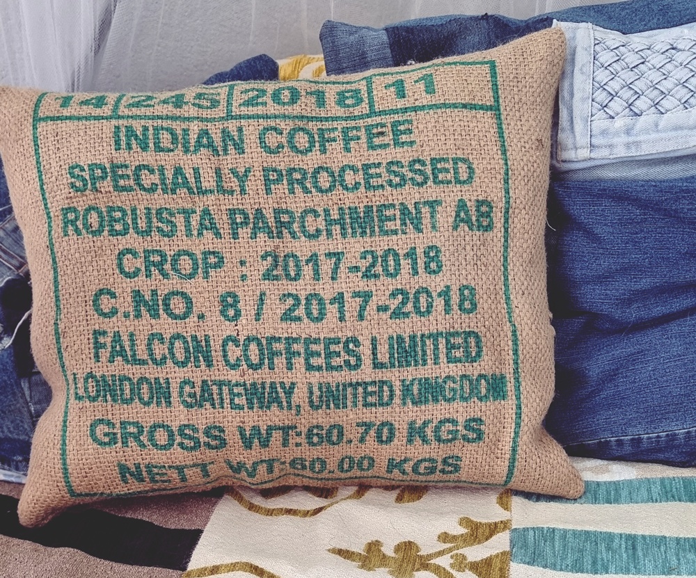 Kahvisäkissä on jotain romanttisen rosoista. Sen painettu teksti, logot ja kuljetusmerkinnät antavat sille luonteen. Minun tyynyssäni lukee “Robusta Parchment AB Crop 2017–2018”, ja jos joku kysyy, vastaan ylpeästi: “Kyllä, tämä on vintagea.”