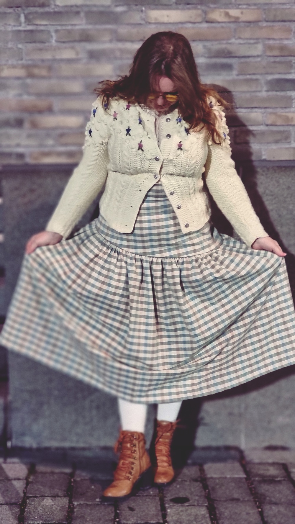 Valitsin hameen, jonka olin ommellut Kierrätyskeskuksen materiaalitukun aarteesta. Sen ruutukangas hengitti menneiden vuosien kotien lämpöä, ja helma liikkui askelissa kuin vanha kirjoitus, joka on vihdoin saanut uuden lukijan.