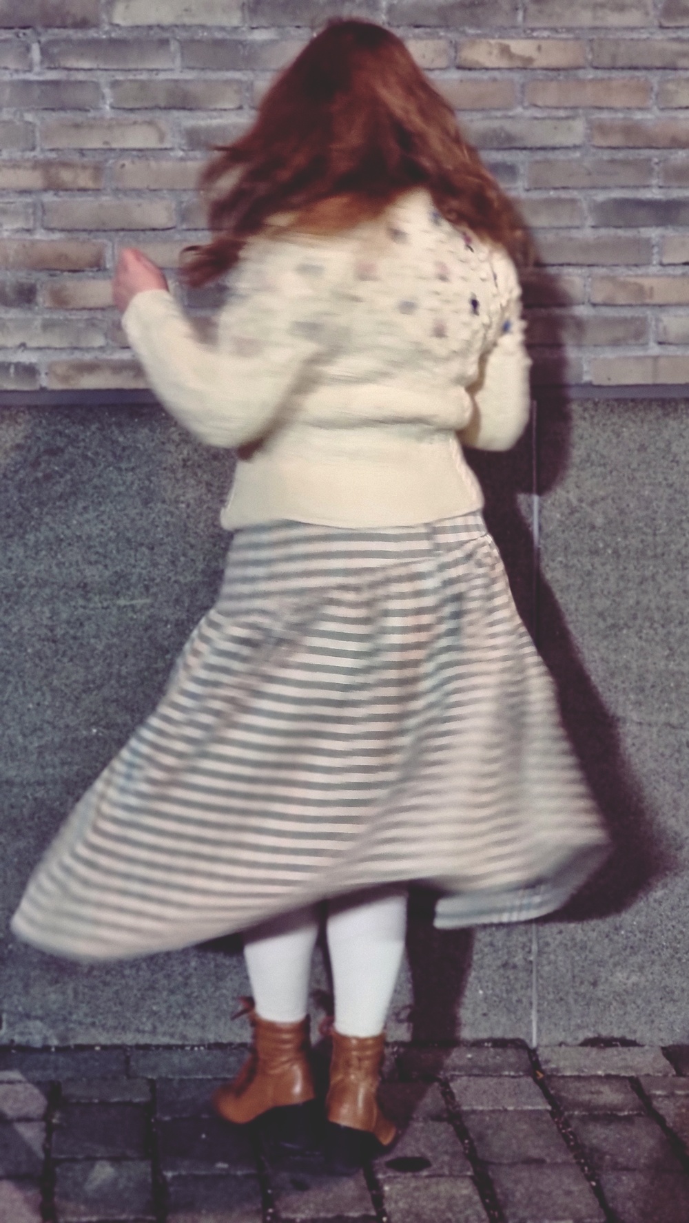 Takki oli tuunattu vuosia sitten omasta vanhasta tekeleestäni, ja sekin kantoi oman historiansa: korjaukset, uudelleen muotoilut, ideat ja unohtuneet ideat. Jalkoihini sujautin nilkkurit, jotka olin löytänyt Maunulan ostareilla sijainneesta Fidasta, sellaiset, joiden nahka on omaksunut jokaisen vuoden, kadun ja askeleen.